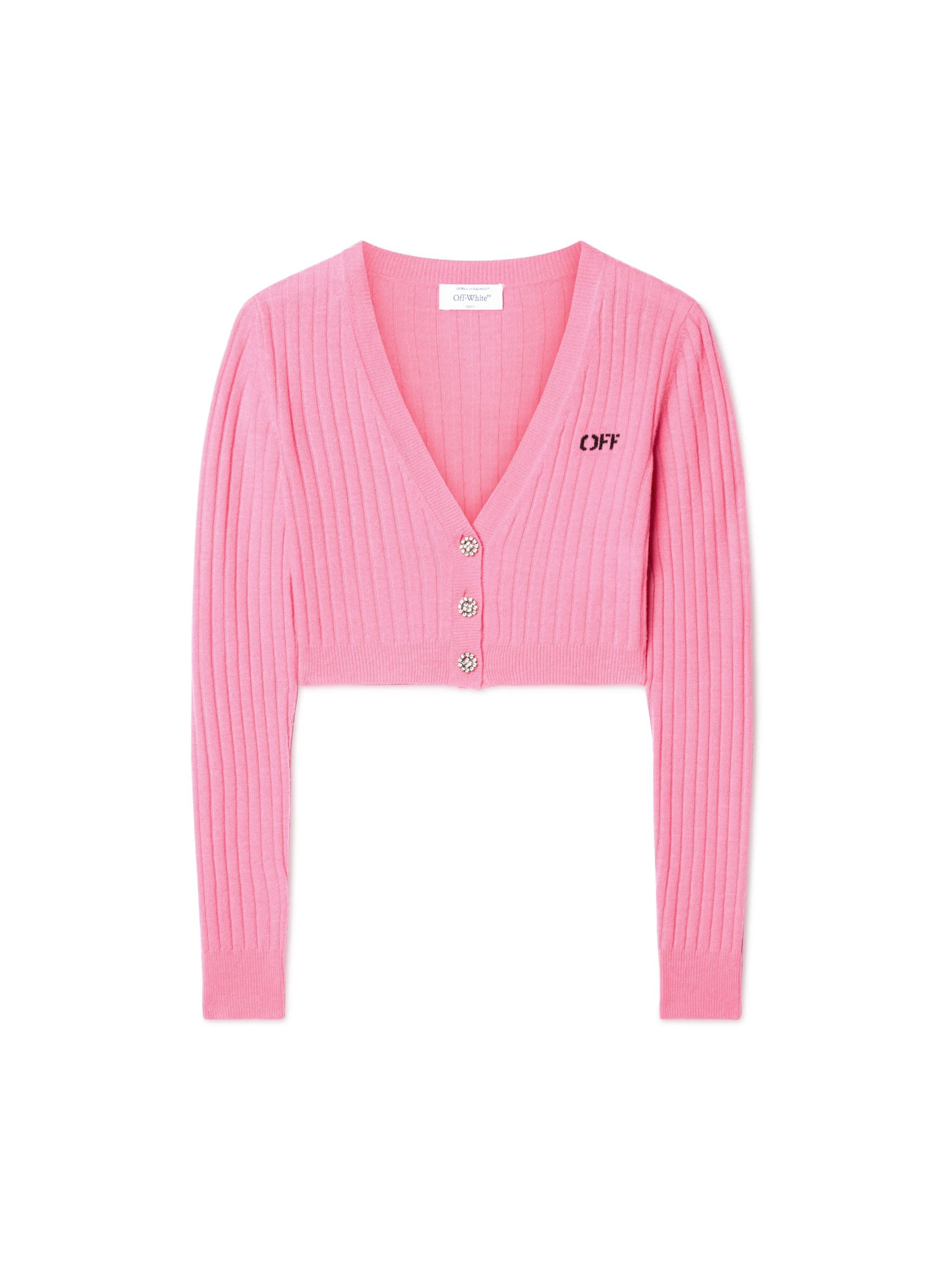 This long-sleeved cropped cardigan is crafted from cashmere and wool with crystal buttons and features a small stencil logo. Made in Italy. MATERIALS 90% Wool 10% Cashmere FITTING Model Yi Xiang wears size S Height: 5' 8'' (177 cm) Chest: 30'' (77 cm) Waist: 25” (60 cm) Hips: 34.5'' (88 cm)
