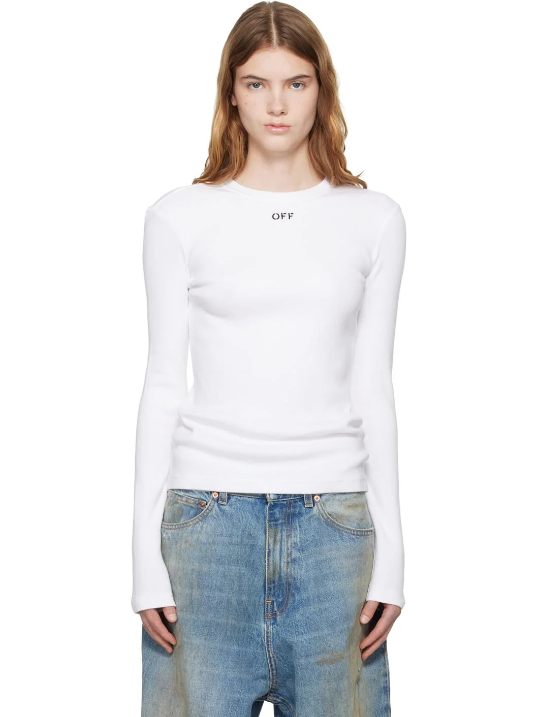 White 'OFF' Stamp Rib Long Sleeve Crew T-shirt
