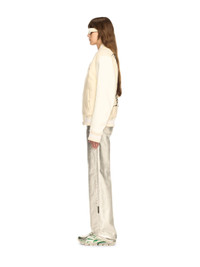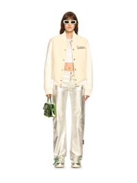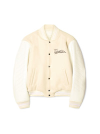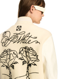 This lined varsity jacket is crafted from a wool-blend with 100% leather sleeves. It features a cursive logo on the front, stitched diagonals on the sleeves and large sequin roses on the reverse with a matching logo. Relaxed fit. DETAILS - JUNI WEARS SIZE 38 HEIGHT: 5' 7” (176 CM) BUST: 28” (73 CM) WAIST: 23“ (60 CM) HIPS: 35” (89 CM) - Materials:Virgin Wool 75%, Leather 100%, Polyamide 25% - Code: OWEK006S25FAB0010B10