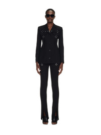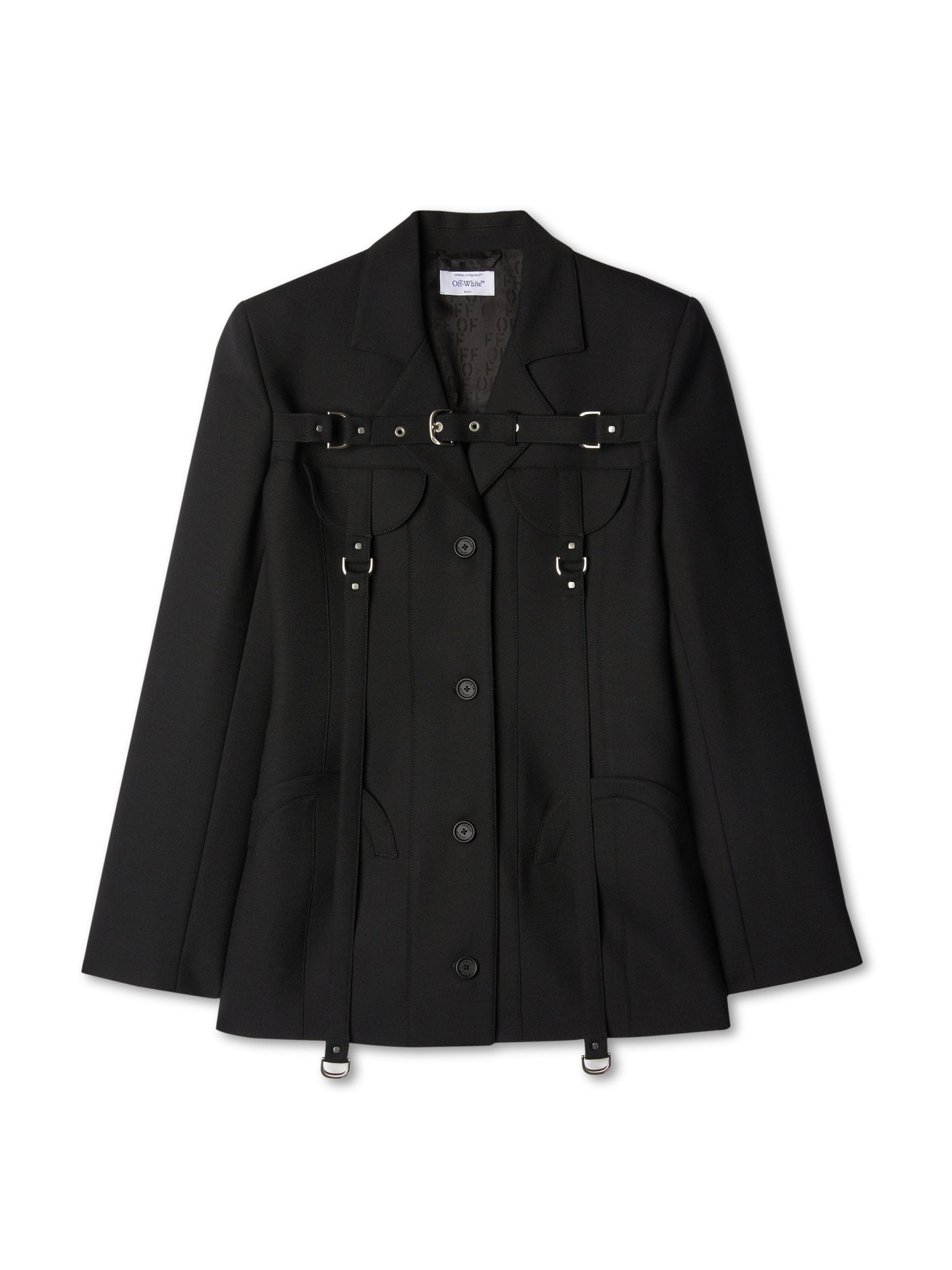 black virgin wool blend decorative buckle detail notched lapels front button fastening long sleeves buttoned cuffs two chest flap pockets silver-tone hardware MATERIALS Outer: 95% Virgin Wool Outer: 5% Elastane Lining: 100% Viscose FITTING Bust 0cm Height 0cm Hips 0cm Waist 0cm