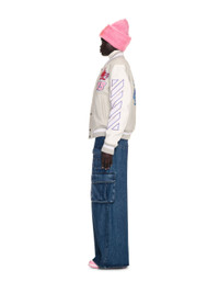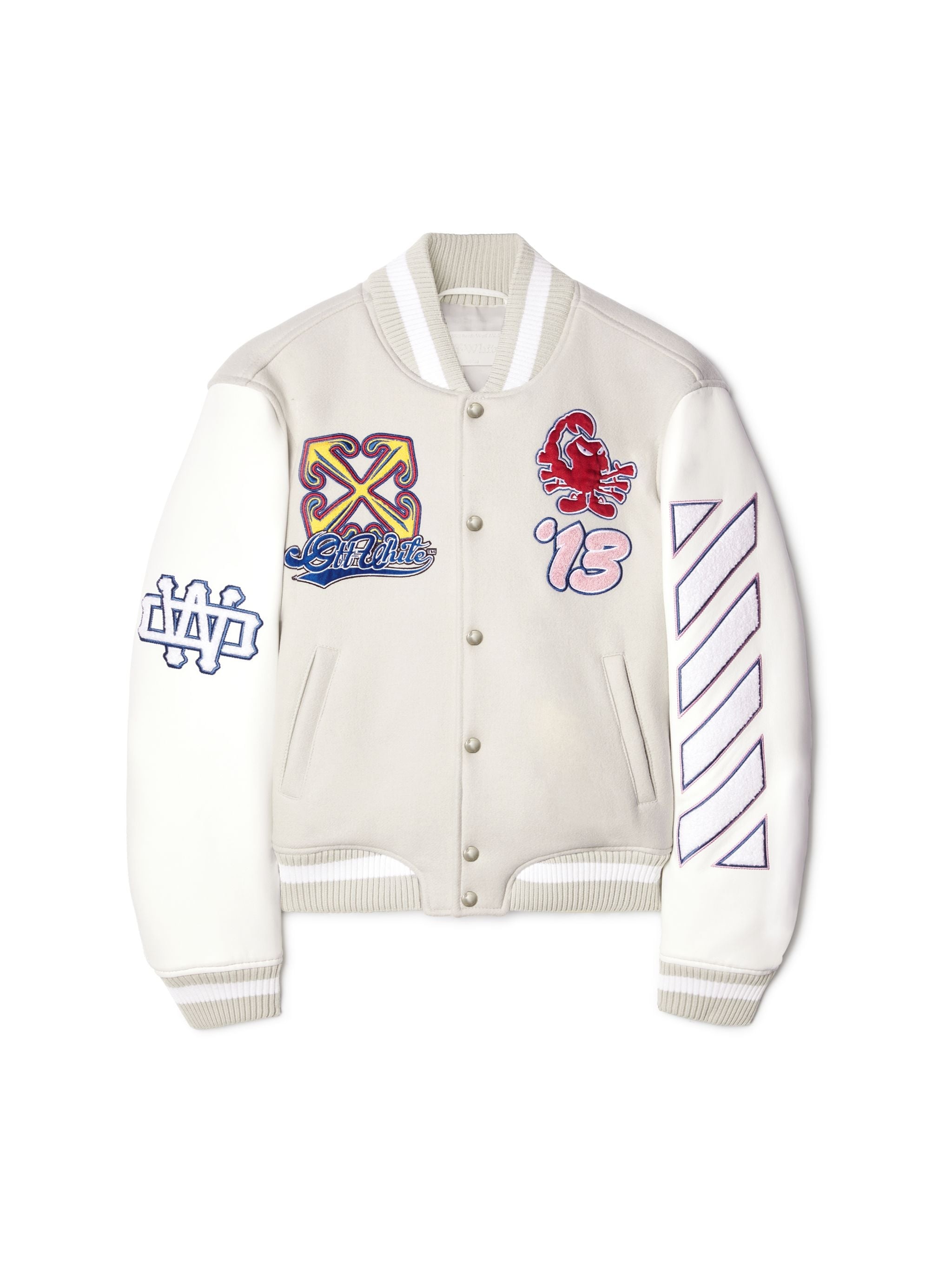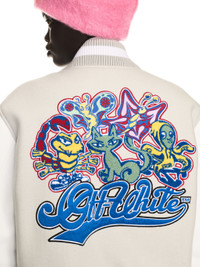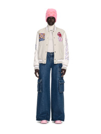 This bomber jacket is crafted from a wool blend and features patch logos on the front and cartoon characters on the reverse. The 100% leather sleeves feature signature diagonal stripes and an initials logo. Regular fit. MATERIALS Outer: 100% Leather Outer: 75% Virgin Wool Outer: 25% Polyamide Lining: 100% Viscose Lining: 100% Cotton Lining: 100% Polyester FITTING Model Athiec Geng wears size 40 Height: 5’ 10" (179 cm) Chest: 30” (76 cm) Waist: 24” (61 cm) Hips: 34.5'' (88 cm)