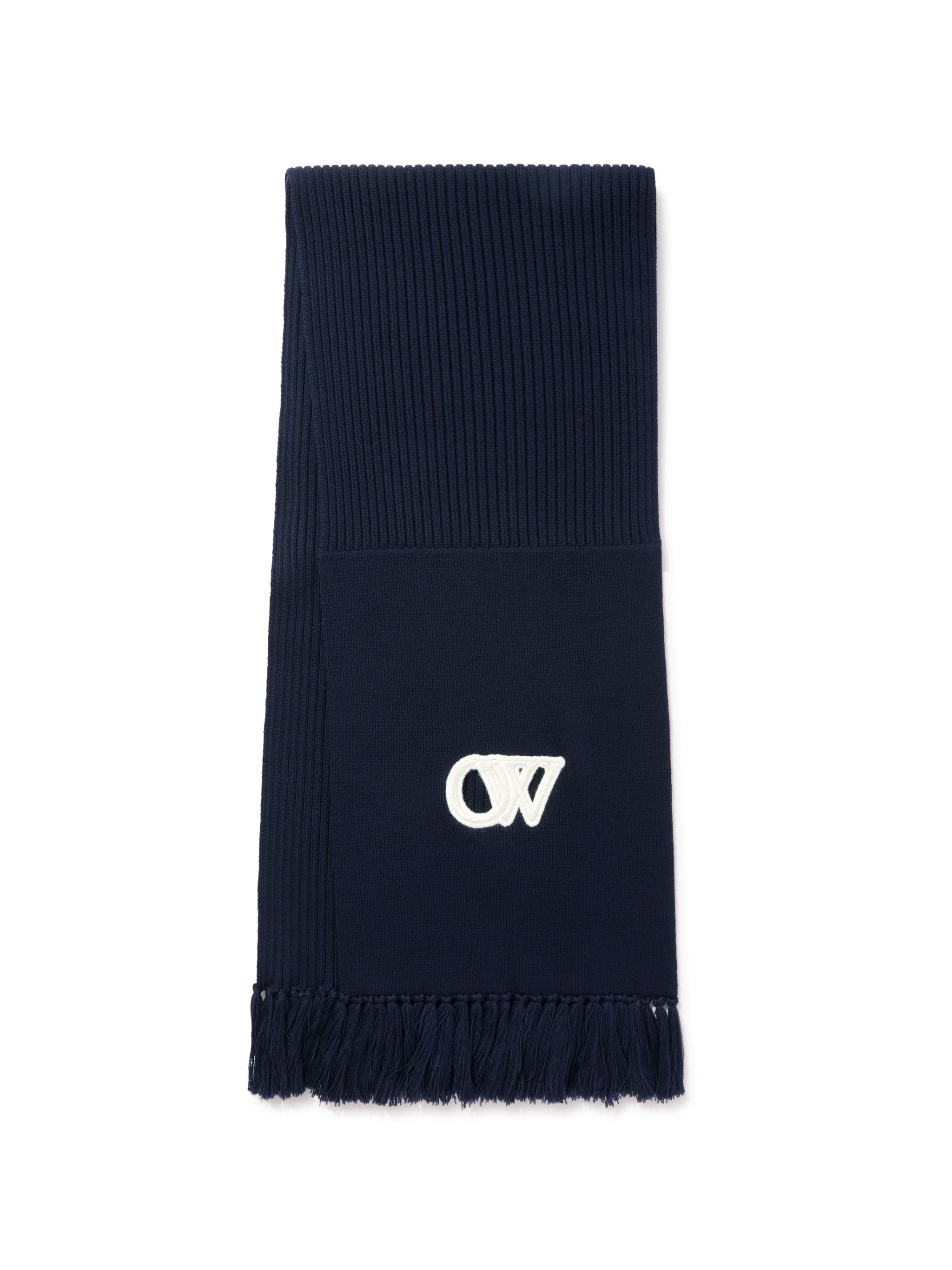 Blue ribbed fringe scarf featuring white Off-White logo patch. MATERIALS 100% Wool FITTING Bust 0cm Height 0cm Hips 0cm Waist 0cm