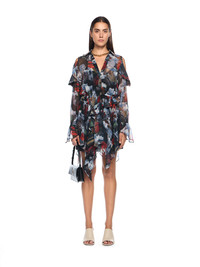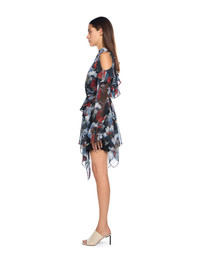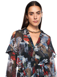 Embrace the avant-garde aesthetic with this World Paint Geo Romantic Dress, merging urban style with bold innovation. - Semi-sheer fabric with abstract print - Cold-shoulder design with ruffled detailing - Asymmetric hemline for dynamic movement - Concealed front button placket - Adjustable waist tie for personalized fit - Long sleeves with ruffled cuffs - Back ruffle detail enhancing silhouette - Made in Italy DETAILS - Material: 100% Polyester - Code: OWDB55LF25FAB0018500