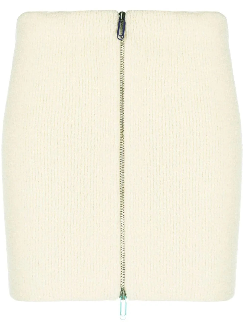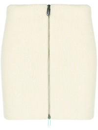 zip-front knit skirt This wool-blend knit skirt from Off-White is infused with the brand's industrial-inspired aesthetic seen in the signature Paperclip zip-pulls that run down the centre of the piece. Made in Italy Composition Wool 81%, Polyamide 9%, Silk 9%, Polyurethane 1% SIZE & FIT Model measurements Height 5 ft 10 in(1.78 m) Bust/Chest 30.31 in(77 cm) Hips 36.61 in(93 cm) Waist 24.8 in(63 cm) FittingInformation This piece fits true to size. We recommend you get your regular size Cut for a close fit Made with a mid-weight fabric Washing instructions Hand Wash