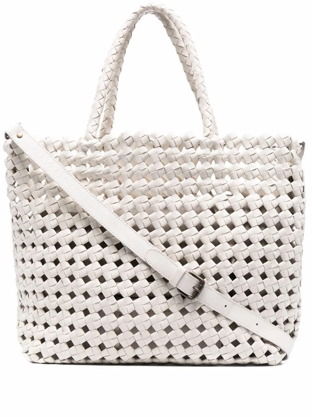 leather tote bag Spacious and versatile, this white tote bag from Officine Creative stands out thanks to its woven leather texture. The accessory comes with two top handles and an adjustable and detachable shoulder strap so it can be worn on the shoulder or hand. Made in Italy Composition Lining: Leather 100% Outer: Calf Leather 100% SIZE & FIT Model measurements Height 5 ft 9 in(1.75 m) Bust/Chest 34.64 in(88 cm) Hips 36.61 in(93 cm) Waist 26.37 in(67 cm) Measurement DEPTH 5.11 in(13 cm) HANDLE 7.87 in(20 cm) HEIGHT 13.77 in(35 cm) STRAP 20.86 in(53 cm) WIDTH 15.74 in(40 cm)