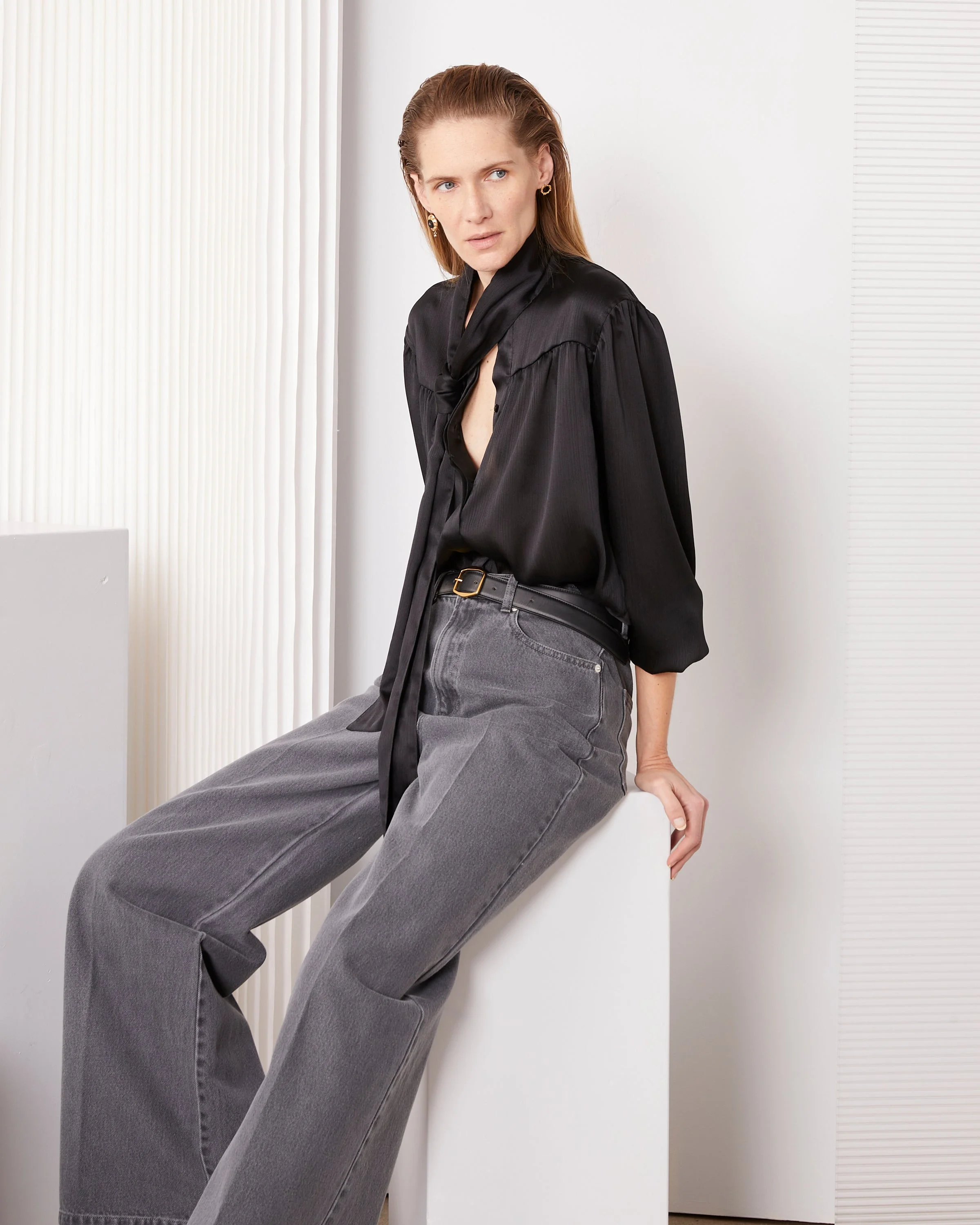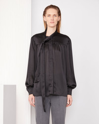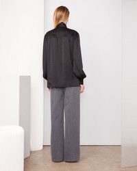 Fluid long sleeve shirt. Loose fit. Round neckline with a lavalliere scarf. Long shirt. Hidden button placket. Gathers at shoulder, cuff, front and back yoke. - 100% Polyester - Loose fit - Round neckline with a lavalliere scarf - Hidden button placket - Gathers at shoulder, cuff, front and back yoke - Made in Portugal - Made in Portugal - dry cleaning only This product sizes normally, we advise you to take your usual size. Our model measures 1m75 and wears a size S. Exists in sizes XS to XL. REF: W25WSHI003