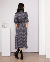 Long dress. Slightely fitted at the waist with flared skirt. Tailored collar. Fold over button placket along the dress. Pleats at front waist. Short sleeves with a turned up hem. Pockets on side seam. Contrasted plain piping on collar front and turned up hem. Exclusive print developed by Officine Generale. Italian satin viscose. Made in Portugal. - 100% viscose - Slightely fitted at the waist with flared skirt - Long dress - Turned down collar with lapel - Fold over button placket along the dress - Pleats at front waist - Short sleeves with a turned hem - Pockets on side seam - Contrasted plain piping on collar front and turned up hem - Exclusive print developed by Officine Generale - Italian satin viscose - Dry cleaning only - Made in Portugal This product sizes normally, we advise you to take your usual size. Our model measures 1m78 and wears a size S. Exists in sizes XS to XXL. REF: W25WDRS100PRE