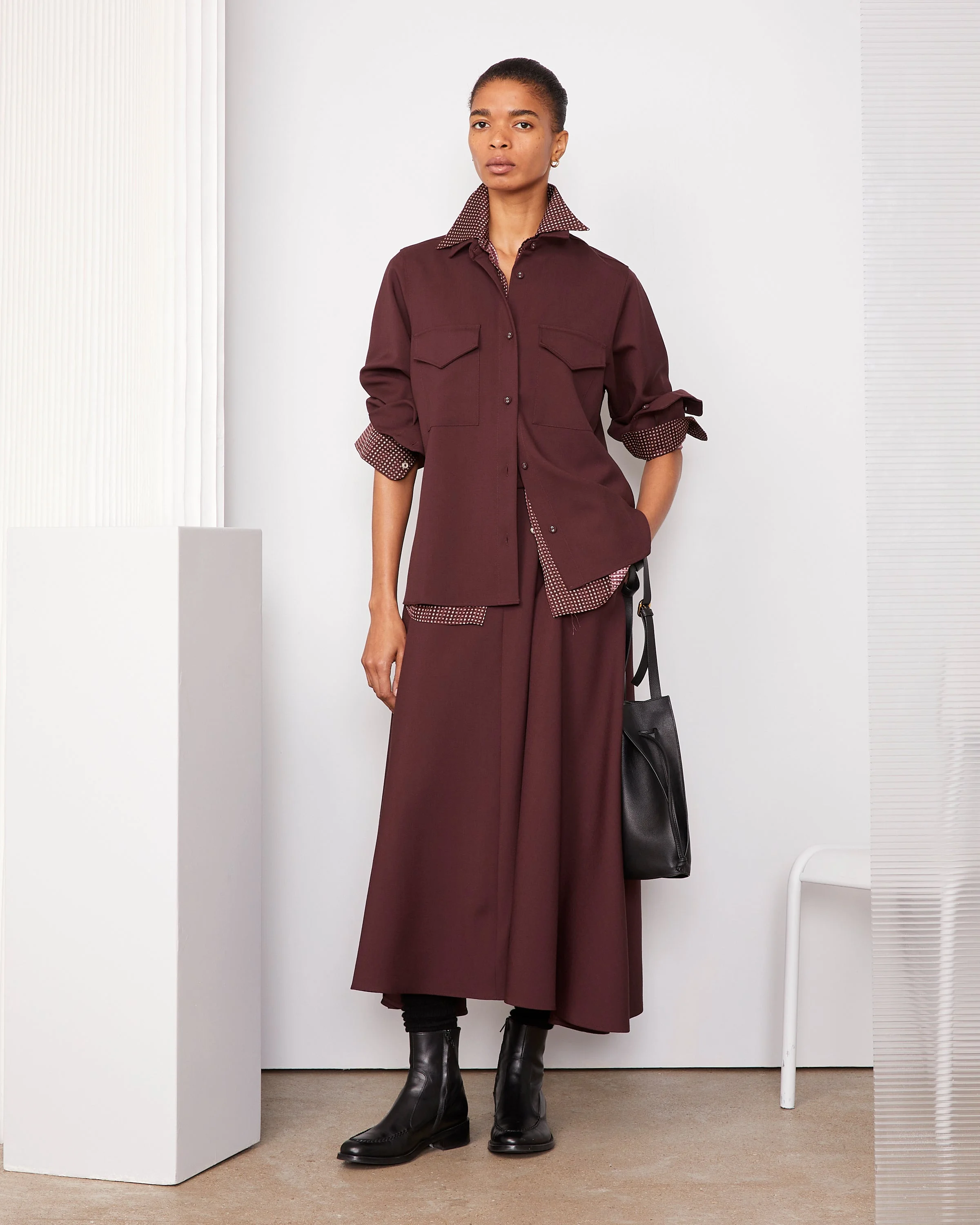 Long sleeve overshirt with patch flap pockets at chest. Pleat at cuffs. Straight hem. Fold over button placket. Slightly loose fit. Italian fresco wool. - 100% Virgin wool - Slightly loose fit - Patch flap pockets at chest - Fold over button placket - Pleat at cuffs - Straight hem - Italian fresco wool - Made in Portugal This product sizes normally, we advise you to take your usual size. Our model measures 1m75 and wears a size S. Exists in sizes XS to XL. REF: W25WOVS070