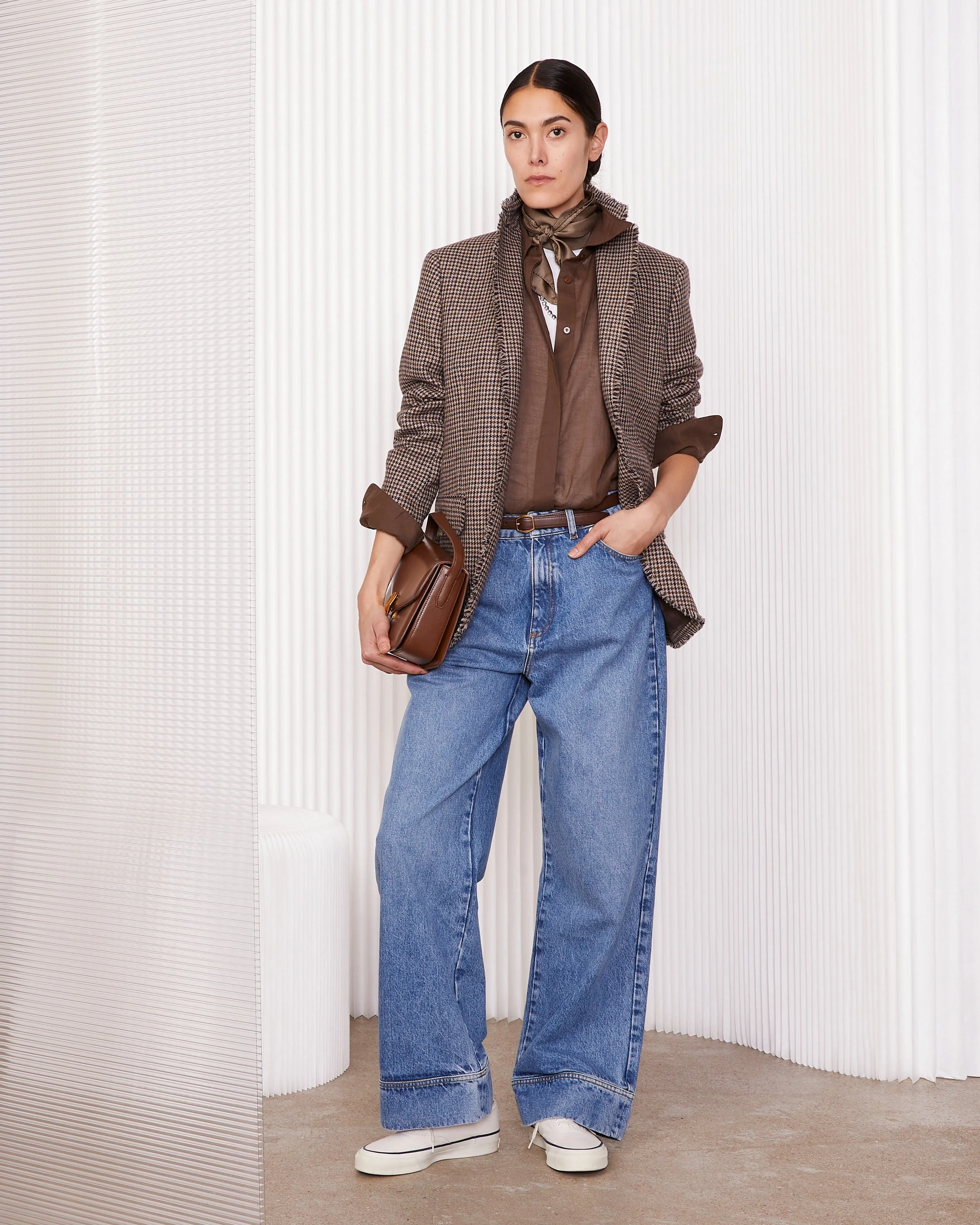 Single breasted two buttons jacket. Classic fit. Soft shoulder. Four-holes fabric-covered buttons. Flap pockets, double vents at back. Fringes on collar, lapel and front. Houndstooth pattern. Italian fabric. Made in Portugal. - 70% wool 30% polyamide - Classic fit - Single breasted two buttons jacket - Soft shoulder - Four-holes fabric-covered buttons - Flap pockets - Double vents at back - Fringes on collar, lapel and front - Houndstooth pattern - Italian fabric - Dry cleaning only - Made in Portugal This product sizes normally, we advise you to take your usual size. Our model measures 1m78 and wears a size 36. Exists in sizes 34 to 44. REF: W25WTLG400PRE