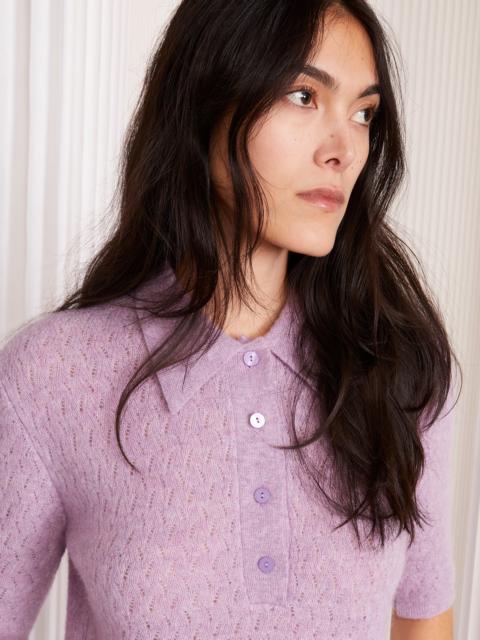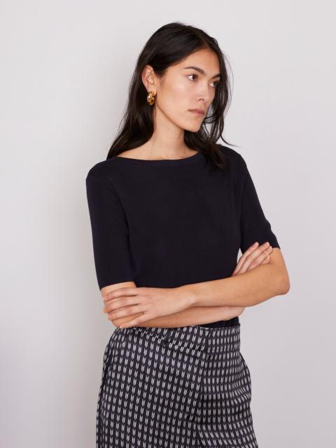 Short sleeves knitted top. Fitted top. Single rib stitch on body and sleeves. Single Rib 2x2 on neckline, bottom sleeve and body. Gage 16. Lyocell and wool yarn. Knitted in China. - 85% lyocell 15% wool - Fitted top - Short sleeves knitted top - Single rib stitch on body and sleeves - Single Rib 2x2 on neckline, bottom sleeve and body - Lyocell and wool yarn - Machine washable with great care. However, we recommend dry cleaning to ensure a long and beautiful life for your sweater. - Made in China This product sizes normally, we advise you to take your usual size. Our model measures 1m78 and wears a size S. Exists in sizes XS to XXL. REF: W25WKNT307PRE