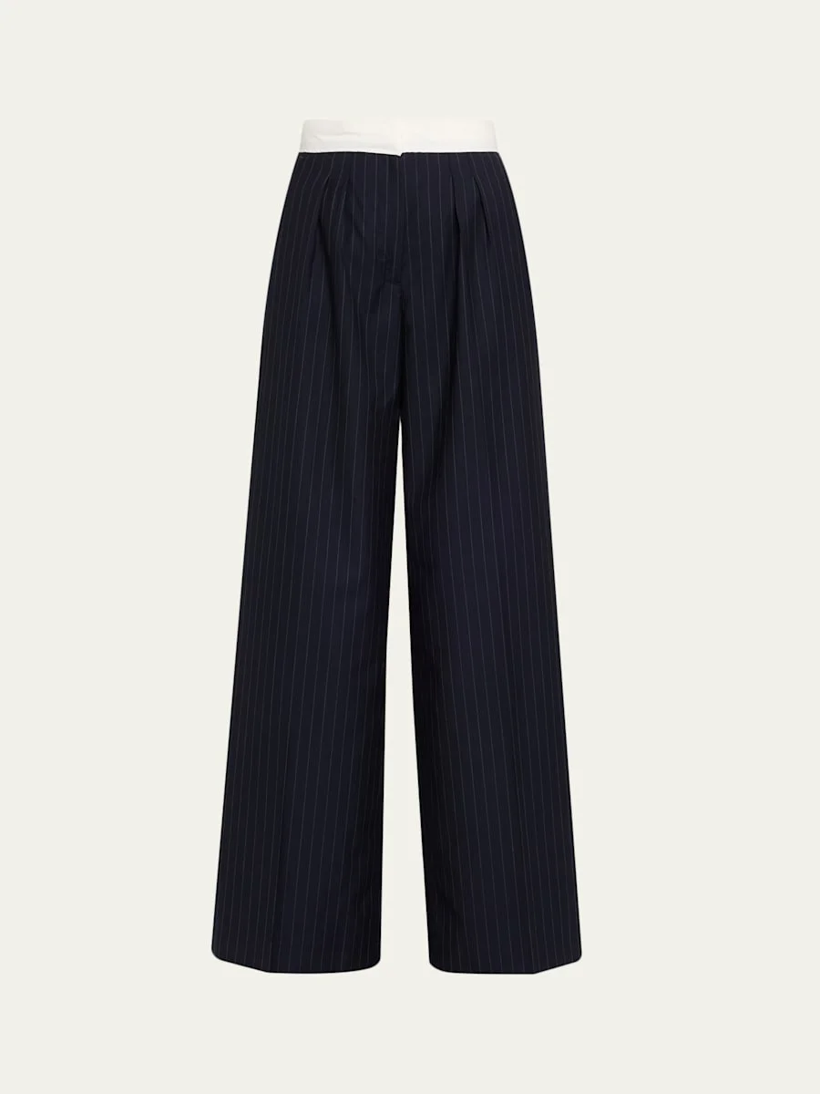 Officine Generale "Elia" double-waistband pants in pinstripe Italian wool High rise Pleated front Four-pocket style Wide legs Full length Hook/zip fly Virgin wool Unlined Dry clean Imported Online Inquiries: BGS21_T6WL5| Store Inquiries: #5053981