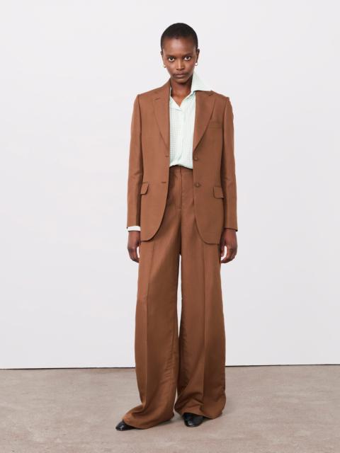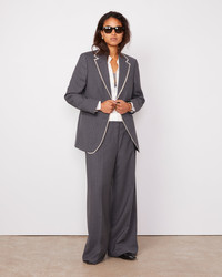 Oversized fit, single breasted two buttons tailored jacket. - 100% Virgin Wool - Regular padding at shoulders - Raw horsehair detail all around collar and middle front - Four-holes fabric-covered button - Piped pockets - Double vents at back - Matching pants available - Dry cleaning only - Made in Portugal This product sizes normally, we advise you to take your usual size. Our model measures 1m75 and wears a size 36. Exists in sizes 34 to 44. REF: S26WTLG405PRE