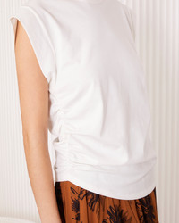 Short-sleeve asymetrical crewneck. Fitted tee-shirt. Gathers on sides. Self fabric collar. Garment wash. Made in Portugal. - 100% cotton - Fitted tee-shirt - Short-sleeve asymetrical crewneck - Gathers on sides - Self fabric collar - Machine washable with similar colors, 30° - Made in Portugal This product sizes normally, we advise you to take your usual size. Our model measures 1m78 and wears a size S. Exists in sizes XS to XXL. REF: W25WTEE200PRE