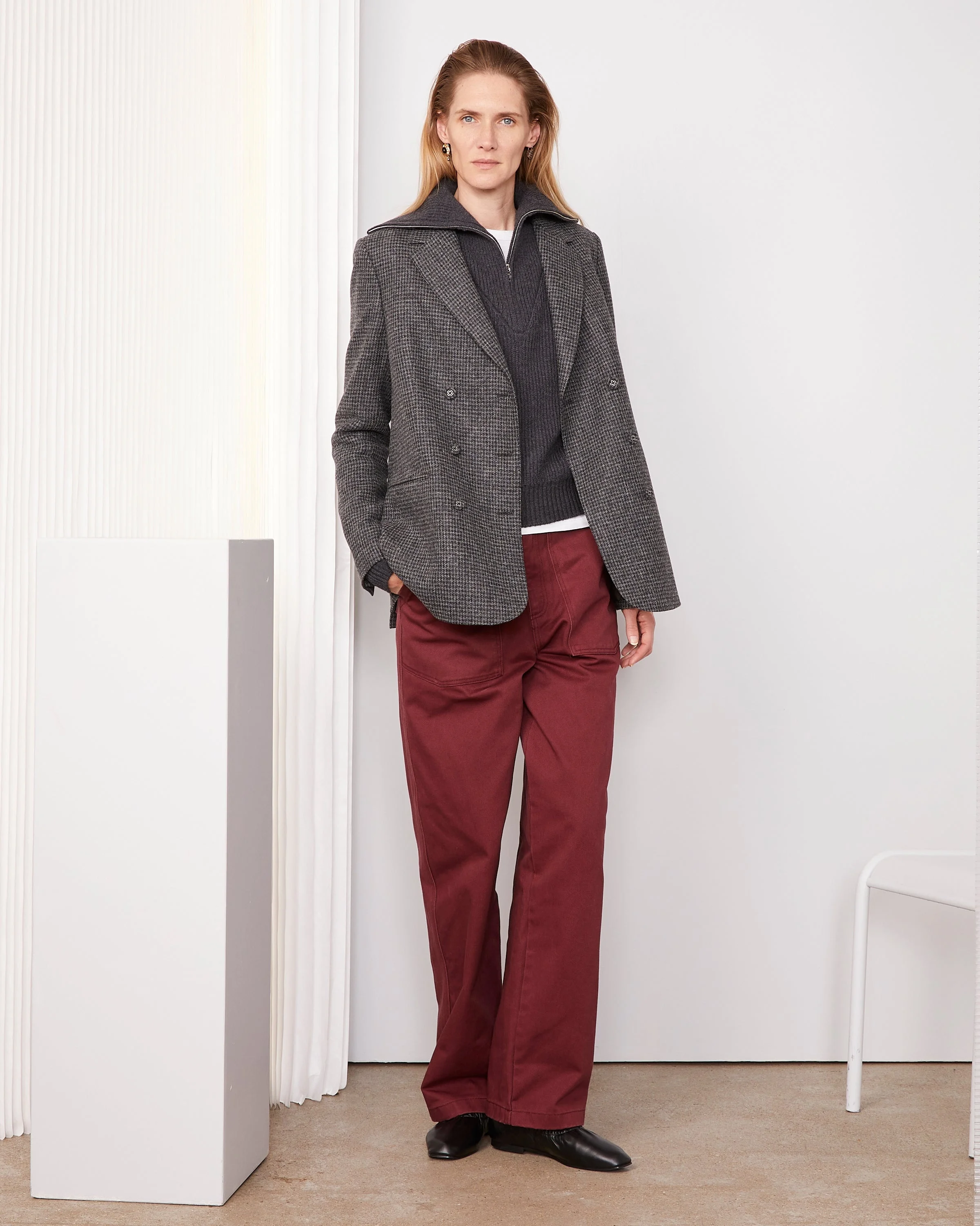 Triple breasted six buttons jacket. Classic fit. Regular padding at shoulder. Welt pockets. Double vents at back. Four holes covered buttons. - 100% Wool - Classic fit - Double-breasted six buttons jacket - Four-holes fabric-covered buttons - Piped pockets - Double vents at back - Italian fabric - Made in Portugal - Machine washable with great care. However, we recommend dry cleaning to ensure a long and beautiful life for your sweater. This product sizes normally, we advise you to take your usual size. Our model measures 1m75 and wears a size 36. Exists in size 34 to 44. REF: W25WTLG410