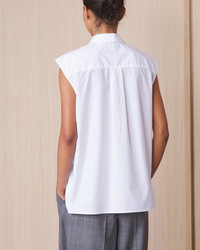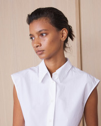 Sleeveless shirt with wide shirt collar. Rounded hem. Folded buttoned placket. Straight back yoke with box pleat. Slightly loose fit. Cotton poplin. - 100% cotton - Slightly loose fit - Sleeveless shirt - Wide collar - Folded buttoned placket - Straight back yoke with box pleat - Rounded hem - Machine washable with similar colors, 30°. - Made in Portugal This product sizes normally, we advise you to take your usual size. Our model measures 1m75 and wears a size S. Exists in sizes XS to XL. REF: S24WSHI001PRE
