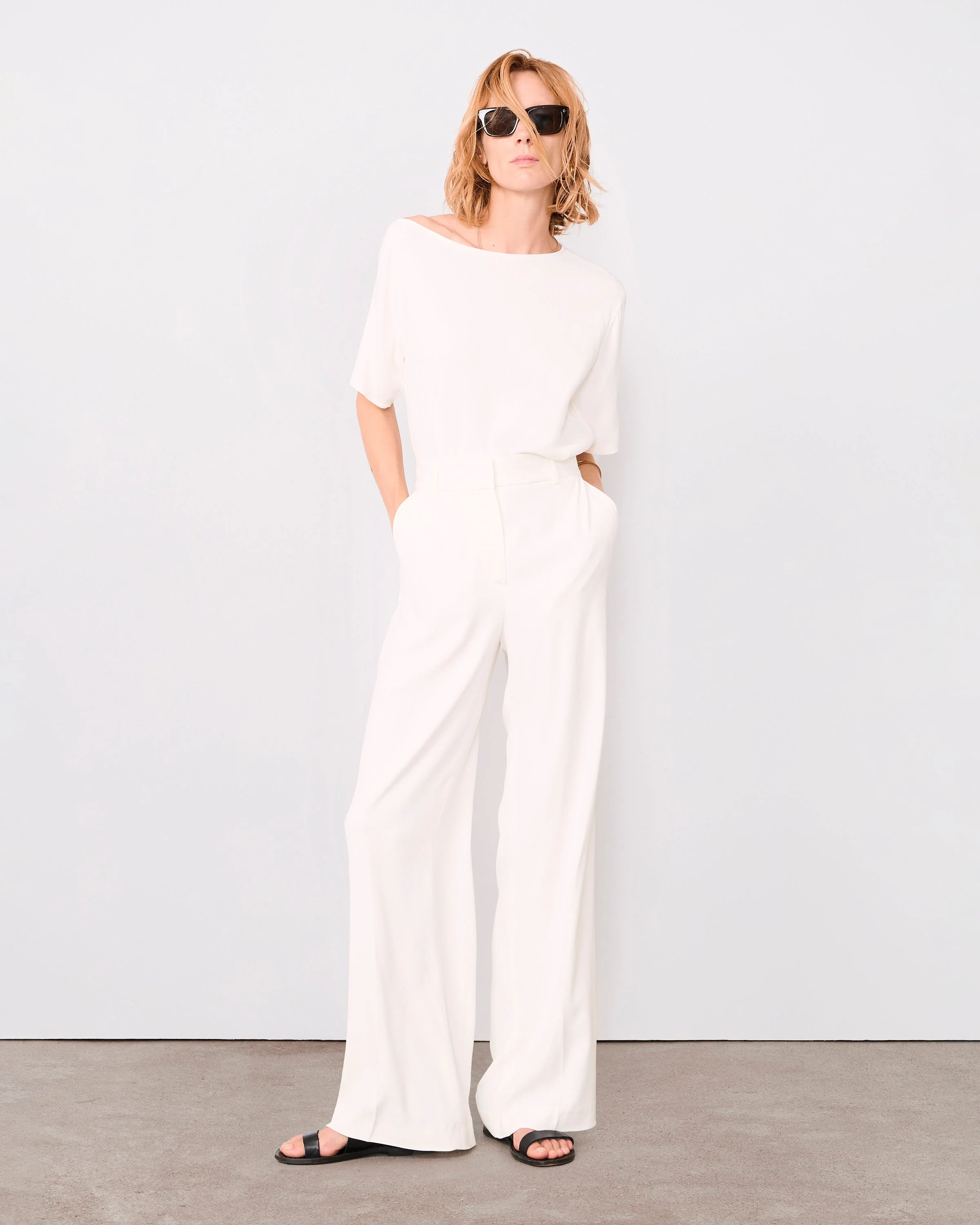 High waisted pants with slightly wide leg. Regular fit. - Permanent pleat at front and back - Italian pockets - Fully lined - Matching top available - Italian fabric - Made in Portugal - Machine washable with similar colors, 30°. This product sizes normally, we advise you to take your usual size. Our model measures 1m75 and wears a size 36. Exists in sizes 34 to 44. REF: S26WTLG455