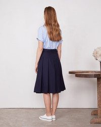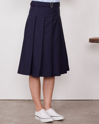 Mid-length high-waisted flared skirt. Slightly A shaped. Pleated skirt, with 5 pleats at front and 5 pleats at back. Invisible zip on side seam. Adjustable self fabric belt. Italian fabric. Made in Portugal. - 100% virgin wool - Slightly A shaped - Mid-length - High-waisted - Flared skirt - Pleated skirt - 5 pleats at front and 5 pleats at back - Invisible zip on side seam - Adjustable self fabric belt - Italian fabric - Dry cleaning only - Made in Portugal This product sizes normally, we advise you to take your usual size. Our model measures 1m78 and wears a size S. Exists in sizes XS to XL. REF: S25WSKT154