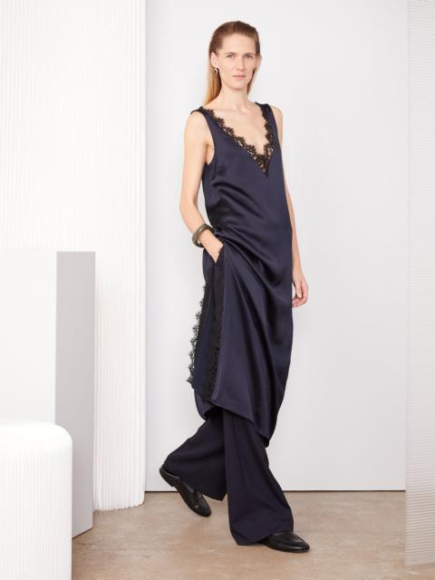 Sleeveless long dress. A-shaped volume. Regular fit. Pronounced V-shaped neckline at front and back. Dress has a long slit on one side. The neckline and slit of the dress are embellished with a contrasting band of French lace. - 100% Viscose - A-shaped cut - Sleeveless dress - Pronounced V-shaped neckline at front and back - slit on the side bottom - French lace around the neckline and the bottom - Italian fabric - Made in Portugal - dry cleaning only This product sizes normally, we advise you to take your usual size. Our model measures 1m75 and wears a size S. Exists in sizes XS to XL. REF: W25WDRS105