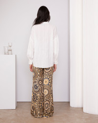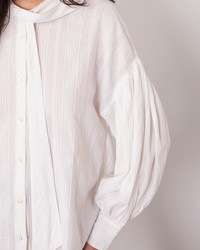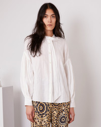 Long sleeve shirt. Loose fit. Band collar with a lavaliere. Fold over buttoned placket. Loose shoulder, gathers on the head and bottom of sleeve. Buttoned cuff. Made in India. - 100% cotton - Loose fit - Long sleeve shirt - Band collar with a lavaliere - Fold over buttoned placket - Loose shoulder, gathers on the head and bottom of sleeve - Buttoned cuff - Machine washable with similar colors, 30° - Made in India This product sizes normally, we advise you to take your usual size. Our model measures 1m78 and wears a size S. Exists in sizes XS to XXL. REF: W25WSHI005PRE