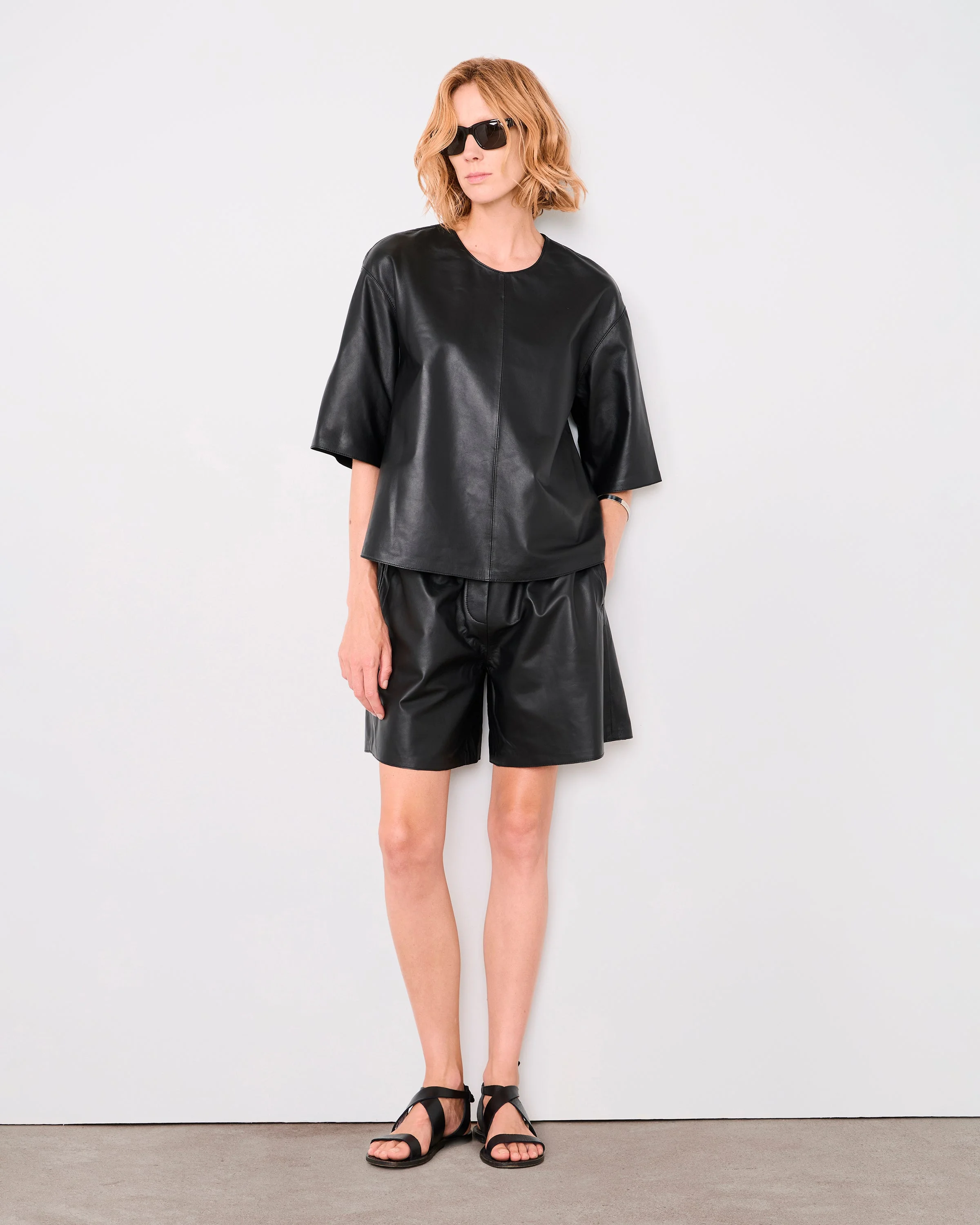 Short-sleeved loose fitted leather top. - Invisible zip at middle back - Raw edge finishing on bottom and sleeves - Fully lined - Made in India - Cleaning by a leather specialist. This product sizes normally, we advise you to take your usual size. Our model measures 1m75 and wears a size S. Exists in sizes XS to XL. REF: S26WLTR553