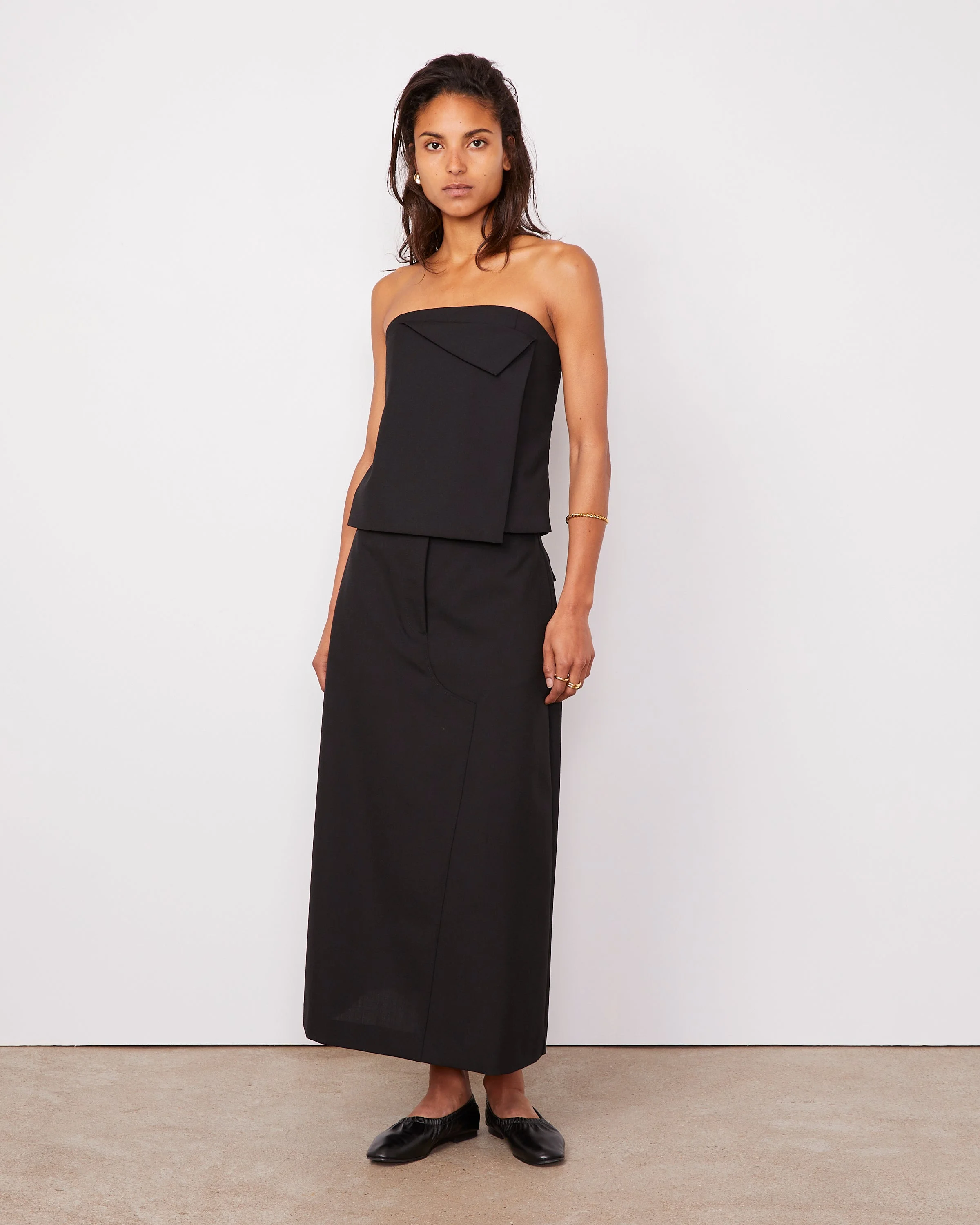 Asymetrical fitted bustier, with reversed front panel. - 100% Virgin Wool - Elastic band at the back - Lingerie tape on front to maintain the top - Invisible zipper on left side - Fully lined - Matching skirt, jacket and pant available - Dry cleaning only - Made in Portugal This product sizes normally, we advise you to take your usual size. Our model measures 1m75 and wears a size S. Exists in sizes XS to XL. REF: S26WTOP051PRE