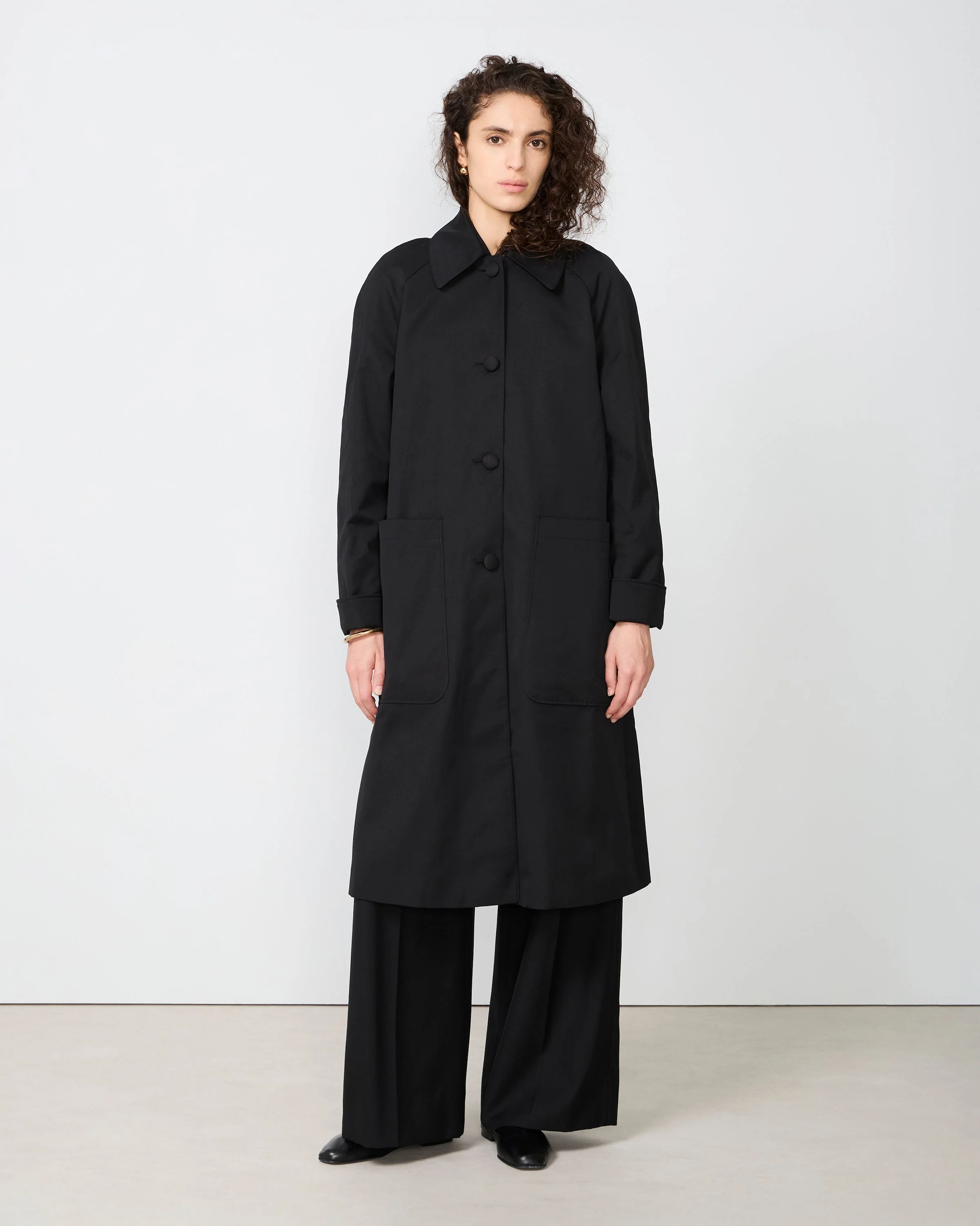Single breasted coat with raglan sleeves. Slightly A-line. Fold over placket, four buttons closure. Round covered buttons. Rounded shirt collar. Large patch pockets. Inverted pleat in the middle back. Fully lined. Water resistant cotton. Made in Portugal. - 65% polyester 35% cotton - Slightly A-line - Single breasted coat ' - Rounded shirt collar - Raglan sleeves - Fold over placket - Four buttons closure - Round covered buttons - Large patch pockets - Inverted pleat in the middle back - Fully lined - Dry cleaning only - Made in Portugal This product sizes normally, we advise you to take your usual size. Our model measures 1m75 and wears a size 36. Exists in sizes 34 to 44. REF: W24WCTS651PRE