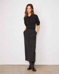 Long pencil skirt. Low waisted. Middle back vent. Hammer waistband with front zipper. Italian sides pockets. Italian fabric. Made in Portugal. - 100% virgin wool - Long pencil skirt - Low waisted - Middle back vent - Hammer waistband with front zipper - Italian sides pockets - Italian fabric - dry cleaning only - Made in Portugal This product sizes normally, we advise you to take your usual size. Our model measures 1m75 and wears a size S. Exists in sizes XS to XL. REF: W24WSKT155
