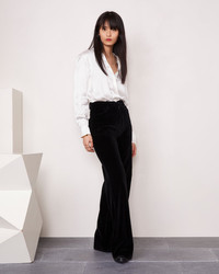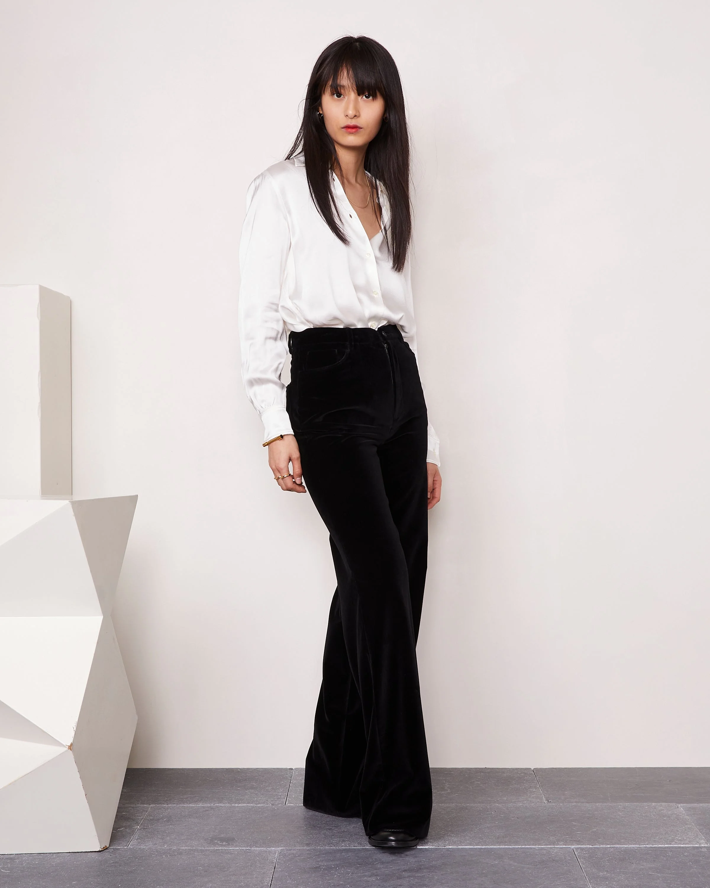 High waisted 5 pockets, wide leg jeans. Italian velvet. Made in Portugal. - 100% cotton - High waisted - Wide leg - 5 pockets - Italian velvet - Machine washable with similar colors, 30°. - Made in Portugal This product sizes normally, we advise you to take your usual size. Our model measures 1m75 and wears a size 27. REF: W24W5PT754