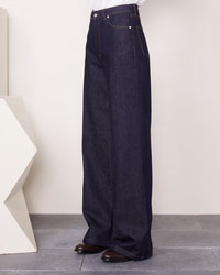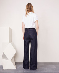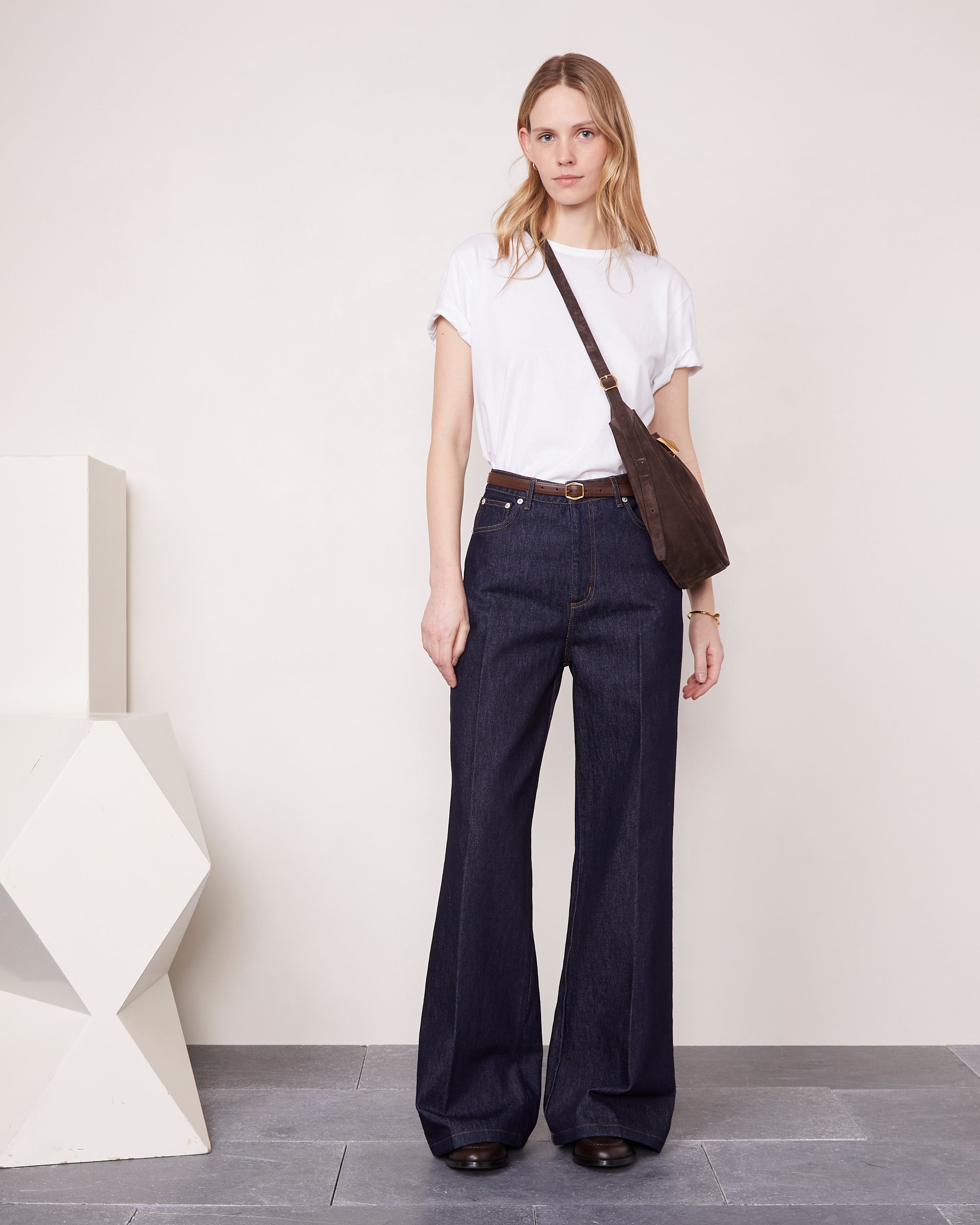 High waisted 5 pockets, wide leg jeans. Constrasted topstichings. Brut cotton denim. Made in Portugal. - 100% cotton - High waisted - Wide leg - 5 pockets - Constrasted topstichings - Brut cotton denim - Machine washable with similar colors, 30°. - Made in Portugal This product sizes normally, we advise you to take your usual size. Our model measures 1m75 and wears a size 27. REF: W24W5PT750