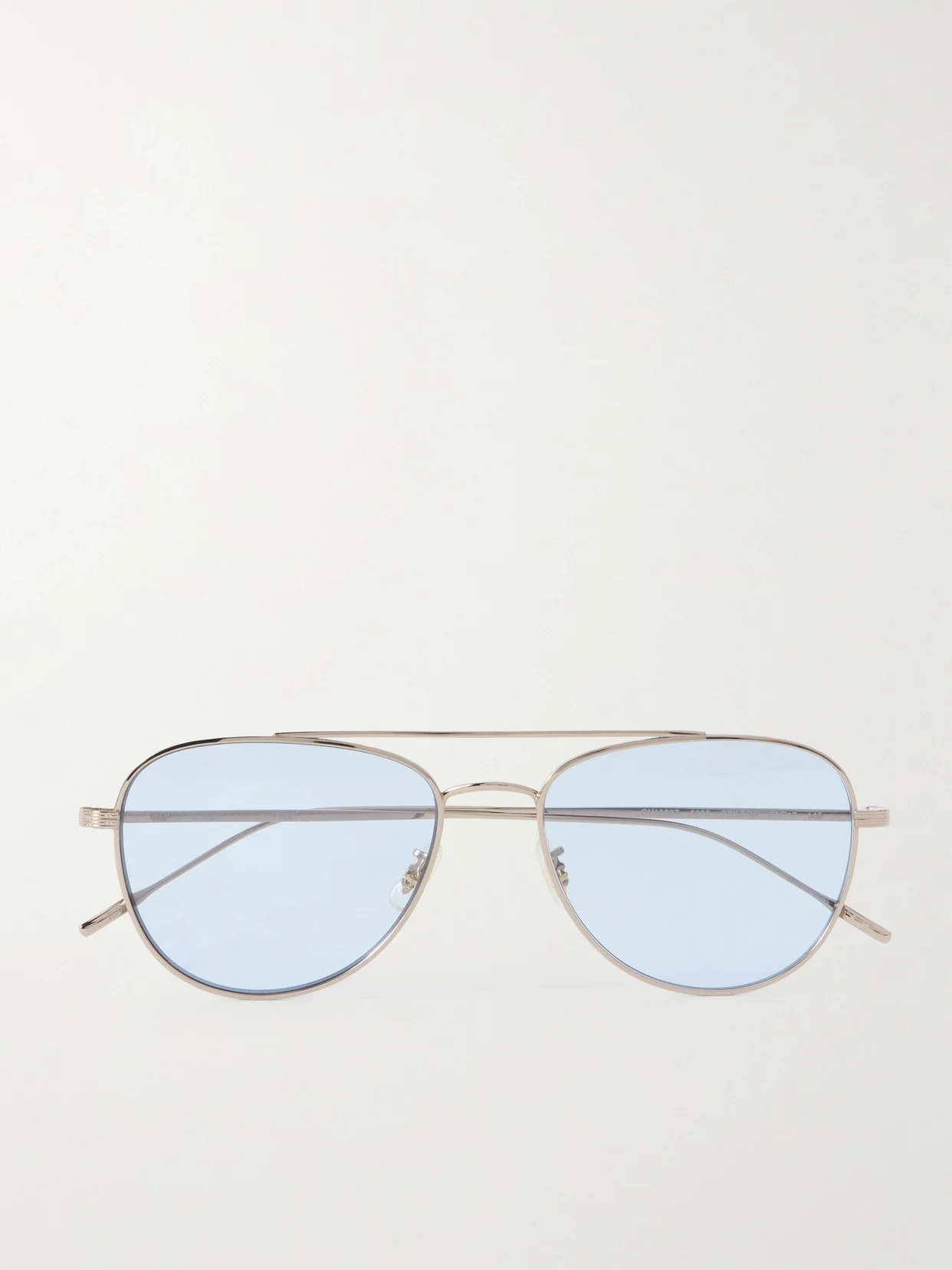 It's hard to beat the sartorial pull of classic aviator sunglasses, like Oliver People's pair. They're made from gold-tone metal and have a signature double bridge and blue-tinted UV protective lenses.