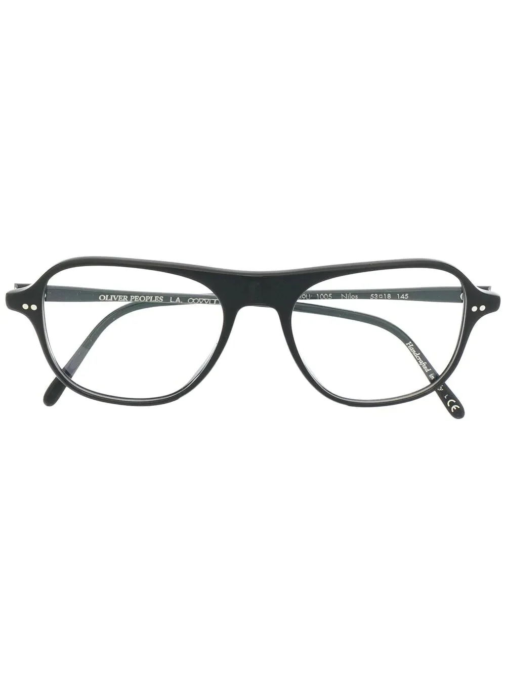 Nilos square-frame glasses black pilot frame clear lenses straight arms We know you'll look after them, but these glasses come with protection, just in case. Made in Italy Composition Acetate 100% SIZE & FIT Measurement Arm Length 5.7 in(14.5 cm) Bridge Width 0.7 in(1.8 cm) Lens Diameter 2.08 in(5.3 cm) Total Width 5.59 in(14.2 cm) Washing instructions LUXOTTICA