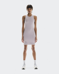A lightweight, soft-to-the-touch ribbed dress with a sleek silhouette. Looks good layered or worn alone. Materials & Transparency Key features - Weight: Noneg - Made with yarn dye to ensure eye-catching, vibrant colors - Streamlined silhouette - Soft, ribbed, two-tone fabric - Flatlock stitching for shape and style - A black reflective logo on the front and back - Can be worn alone or layered