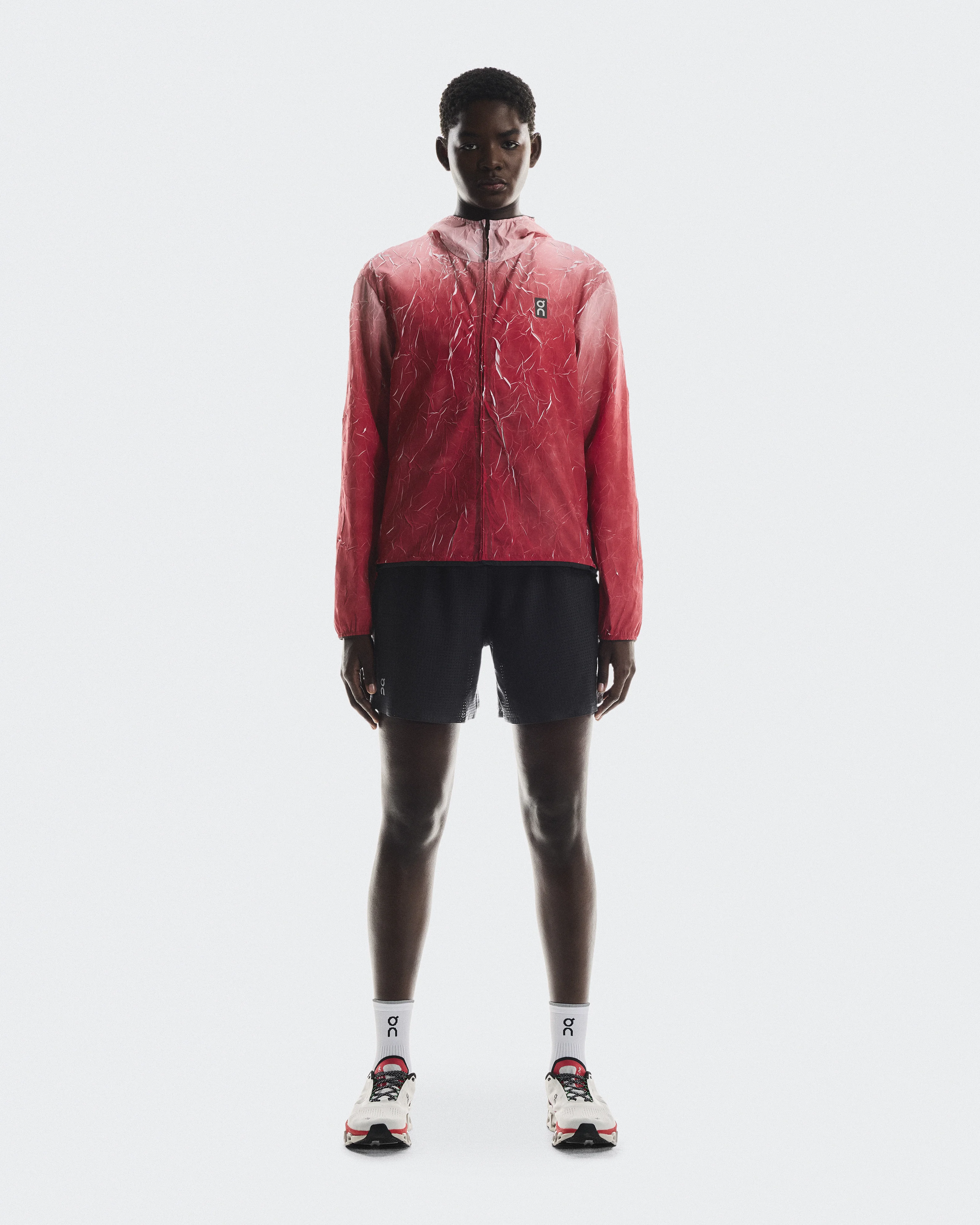 A high-performance jacket made in a water-resistant (DWR) finish. With thoughtful details to keep you running outdoors. Materials & Transparency Materials Main Fabric: Polyester (recycled) 58%, Polyester 42%. Pocketing: Polyester (recycled) 58%, Polyester 42%. Key features - Weight: Noneg - Packs away into one of the pockets - Hooded design for coverage - Water-resistant (DWR) finish - Standout print - Two zipped side pockets and a small carabiner - Made with CleanCloud® fabric - Eyelets in armpit for breathability - Adjustable hem