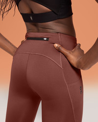 The performance-ready running tights with added storage for your phone, keys, and more – now in a 7/8 cropped length. Pair with your favorite On layers and trainers. Materials & Transparency Materials Main fabric: 75% recycled polyester, 25% elastane Waistband fabric: 82% polyamide, 18% elastane Supplier Transparency Regina, China Key features - Weight: Noneg - Zipped back pocket plus a large side pocket for valuables - Adjustable waistband for an adaptive fit - Luxe cropped leg construction - Moisture-wicking fabrics