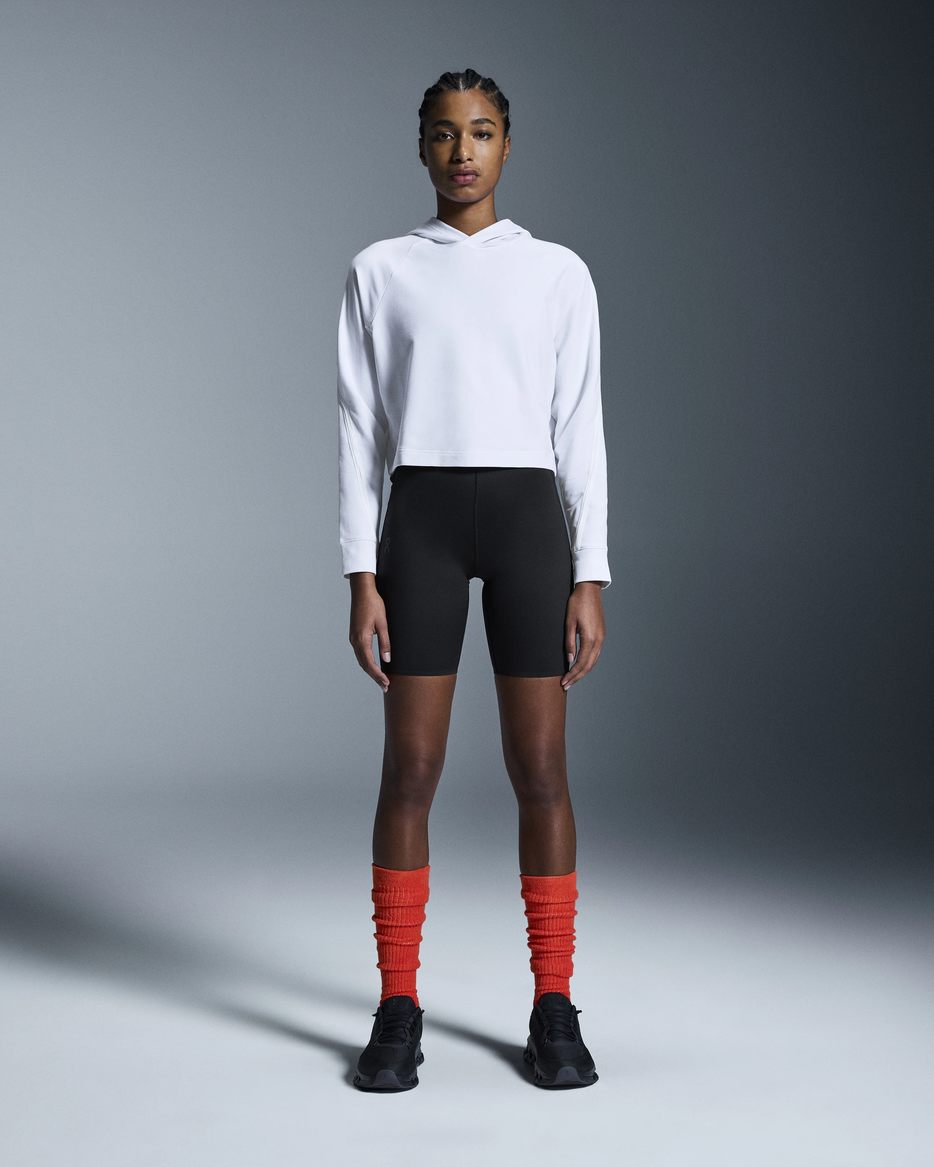 This cropped, relaxed-fit hoodie is ready to move. Athletic aesthetic, ideal for low-intensity workouts and daily wear. Materials & Transparency Key features - Weight: Noneg - Soft to the touch fabric - Designed to fit comfortably on the body - Slit design along the arm with inserted mesh fabric - Premium rib on neckline, cuffs and back hem - Cropped, minimalist design - For low-intensity activities like yoga and Pilates - Slits with mesh for breathability