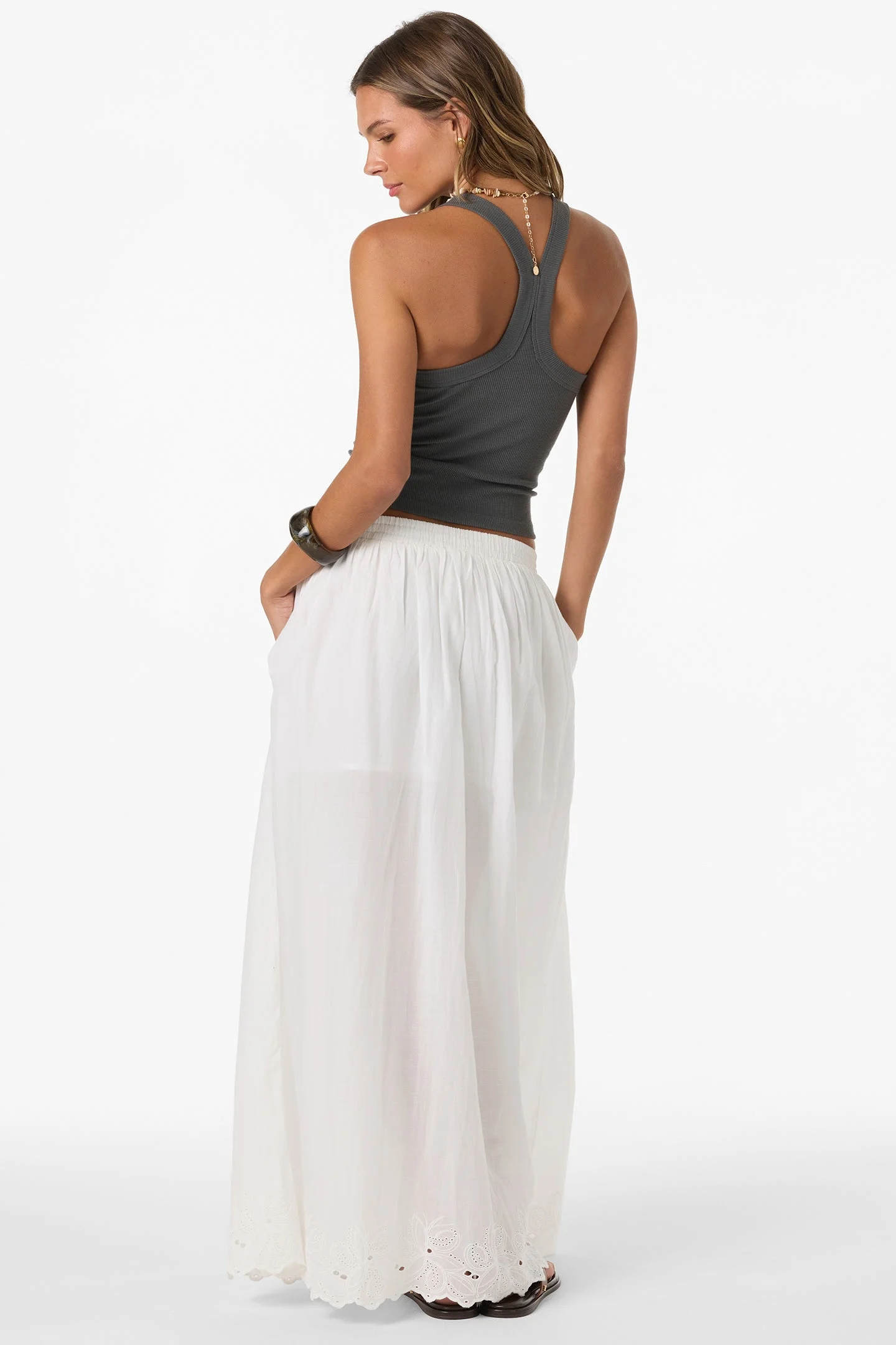 The Annalee Skirt is your partner for a comfortable feel and fun style. This fully lined maxi features an elastic waist for easy wear, light fabric, and functional pockets. - Woven Pull-On Maxi Skirt - 100% Cotton Schiffly, 65 GSM - 40'' Center Front Length - Mid Rise - Elasticated Waistband - On-Seam Pockets - Lining SKU: SU2641504|WHT