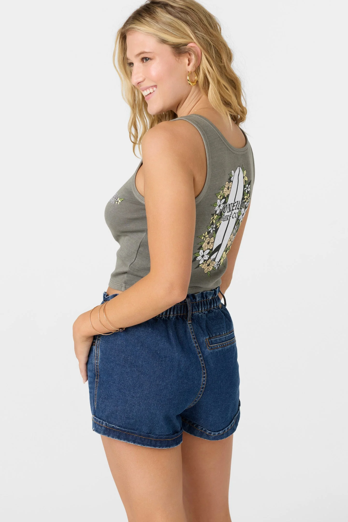 Sweet and essential graphic tank that has a crop length fit and high-quality screen print. - O'Neill Women's tricia tank - 17.5" In length - Garment Pigment Dye - Crop length fit - Screen print graphic - 100% Cotton SKU: SP5418003|GRY