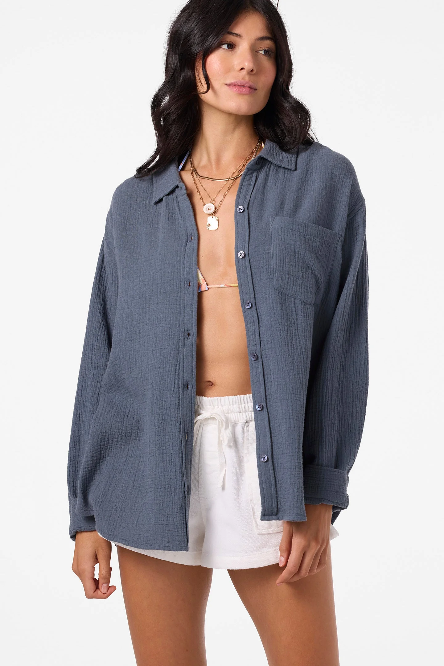 Effortlessly cool woven long sleeve top that has an oversized fit design, front button closure with collar and yarn dye solid wash. - Women's woven long sleeve - Oversized fit - Tunic length - Front button closure with collar - Yarn dye solid - 100% Cotton Crinkle Double Gauze SKU: SP5404014|SLT