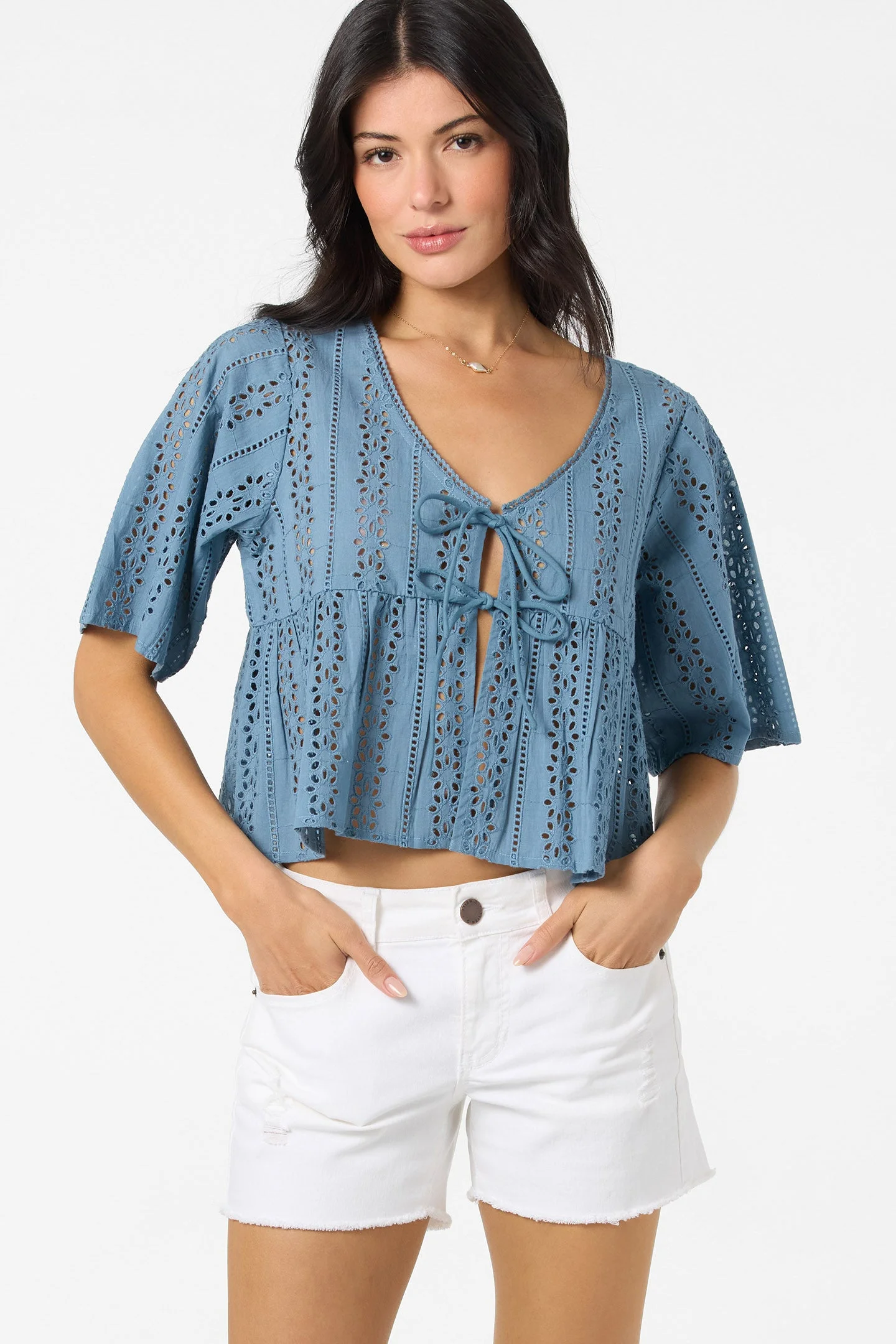 A light and cute top perfect for the next sun-filled day. - Woven SS - 100% Cotton Schiffli Eyelet, 140 GSM - 19 3/4'' Length from HPS - Lace Trim at Neckline - Flyaway Tie Front - Peplum Hem SKU: SP2640410|PRBL Model Details Inez is wearing a size Small. - Height: 5' 8" - Bust: 32" - Waist: 25" - Hips: 35"