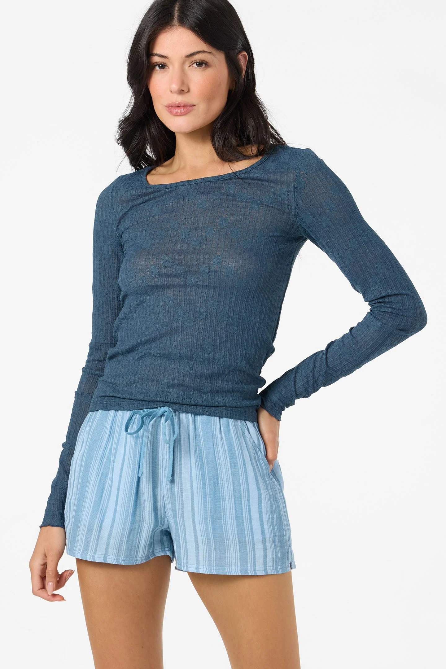Bring easy elegance to any outfit. This lace long sleeve top features a Rosemary lace pattern and Lettuce hem at the sleeve openings. - Knit Long Sleeve - 94% Nylon, 6% Elastane, 145 GSM - 17 3/4'' Center Front Length - Rosemary Lace Pattern - Lettuce Hem at Sleeve Opening - Self Binding at Neck SKU: SP2640307|SLT Model Details Inez is wearing a size Small. - Height: 5' 8" - Bust: 32" - Waist: 25" - Hips: 35"