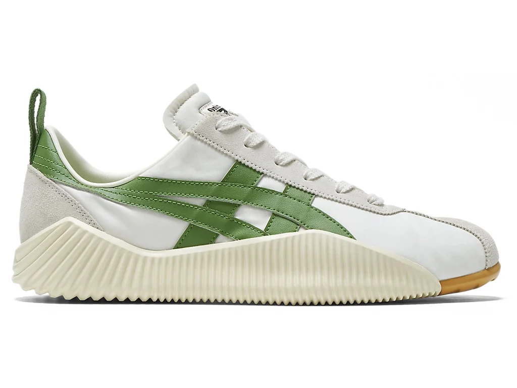 Inspired by the design of spiked track shoes from the 1970s, we introduce this new model in a leather and fabric combination with chic vintage touches. The slim silhouette of the toe is paired with a voluminous sole, similar to that of the 1970s track shoes. The sole has been updated to better suit a modern lifestyle; it is constructed with a combination of lightweight sponge and rubber. The oversized Onitsuka Tiger Stripes in contrasting colors accentuate the classic upper design. - Fabric and leather upper - fuzeGEL technology in heel for superior cushioning - OrthoLite X40 inner sole for bounce-like fit and soft ground impact DETAIL INFORMATION - Brand: Onitsuka Tiger - Country of Manufacture: Vietnam - Part No: 1183B257 - 1183B257.105 CREAM/SPINACH GREEN - Upper material/surface: Synthetic fiber×Leather×Faux leather - Outer Sole Material: RUBBER