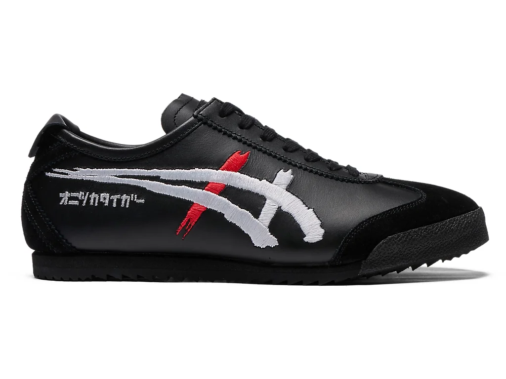 Our signature MEXICO 66 DELUXE style featuring embroidered Onitsuka Tiger Stripes, as if delicately painted on in the style of traditional calligraphy. The expressiveness of the Onitsuka Tiger Stripes is juxtaposed against the words "Onitsuka Tiger" embroidered in Japanese Katakana characters. - Made in Japan DETAIL INFORMATION - Brand: NIPPON MADE - Country of Manufacture: Japan - Part No: 1182A188 - 1182A188.001 BLACK/WHITE - Upper material/surface: LEATHER - Outer Sole Material: RUBBER