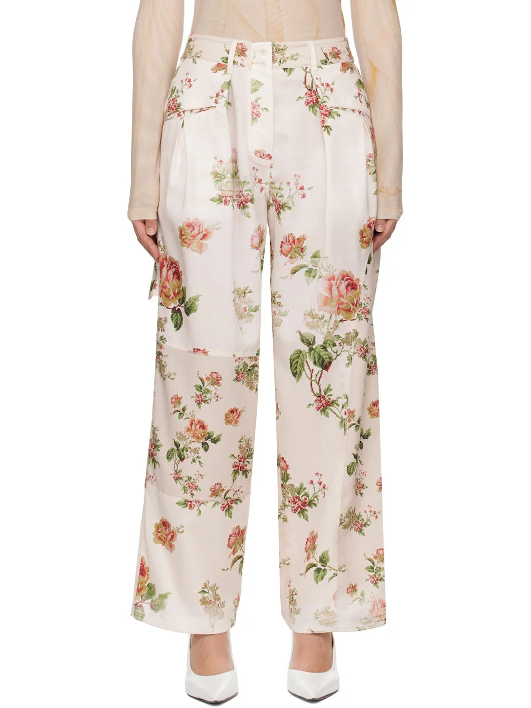 Wide-leg polyester satin trousers. Floral pattern printed throughout. - Belt loops at partially elasticized waistband - Four-pocket styling - Button-fly - Pleats at front - Hammer loop at outseam Supplier color: Beige