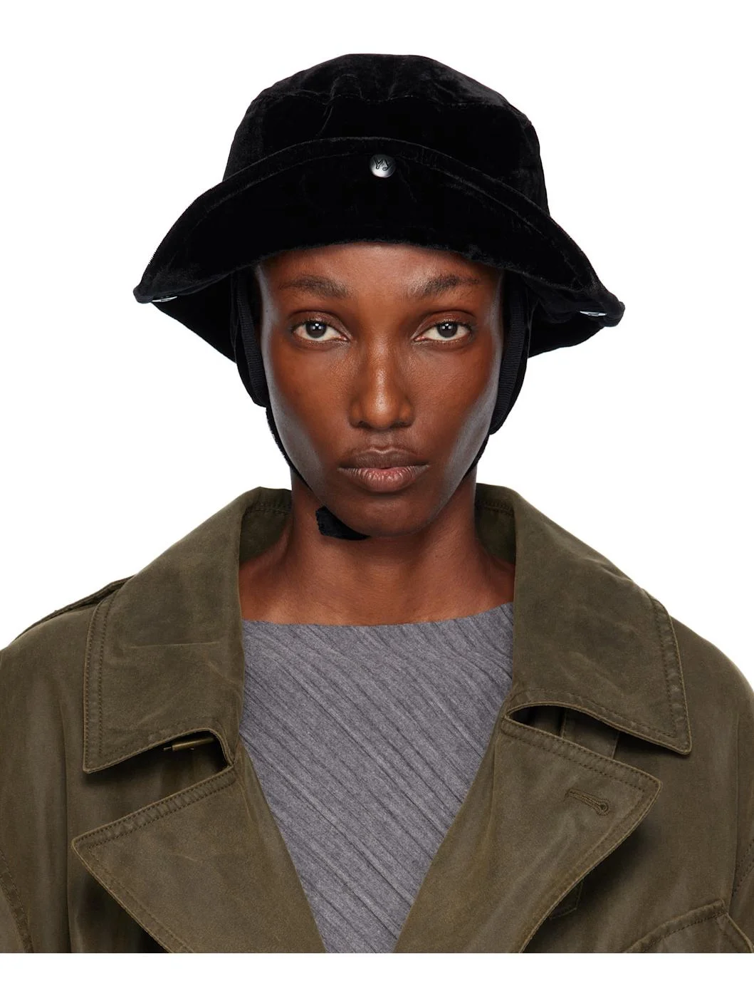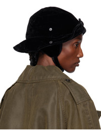 Rayon-blend velvet bucket hat. · Logo embroidered at face · Press-stud fastening at sides and back · Pliable wire at brim · Detachable ear flaps with press-stud chin strap · Satin twill lining · Logo-engraved hardware Supplier color: Black Body: 65% rayon, 35% polyester. Lining: 100% polyester. Made in South Korea 252731F015000