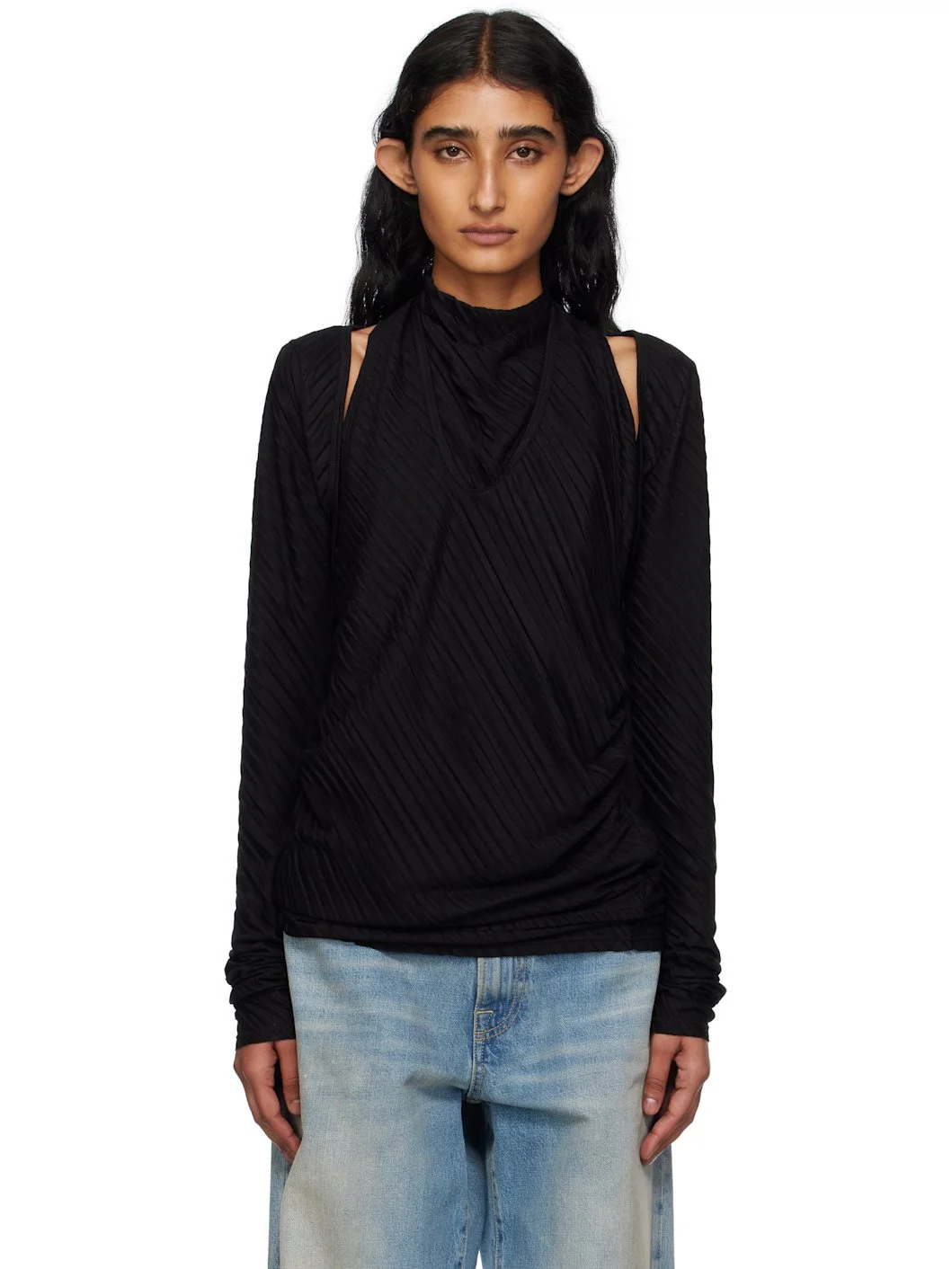 Garment-pleated rayon-blend jersey top. · Layered construction · Bolero and halter top overlays · Mock neck Supplier color: Black 65% polyester, 35% rayon. Made in South Korea 252731F110004