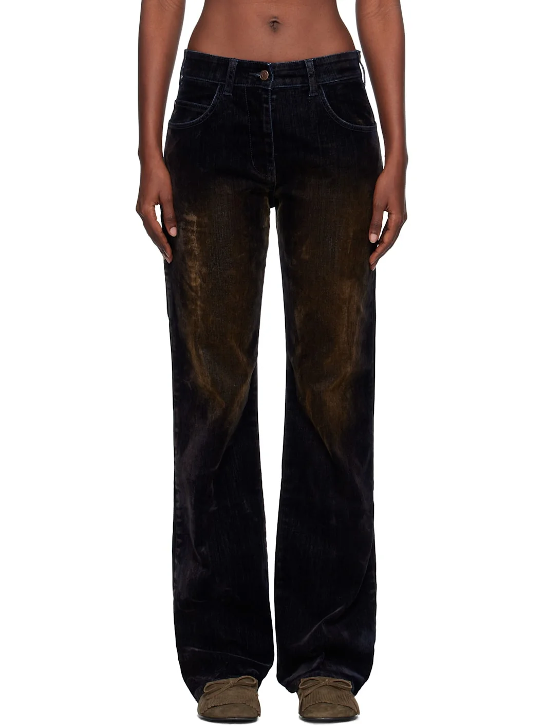 Flocked stretch denim jeans. · Fading throughout · Belt loops · Five-pocket styling · Zip fly · Logo patch at back waistband · Patch pockets at back leg · Logo-engraved antiqued copper-tone hardware Supplier color: Black Body: 98% cotton, 2% polyurethane. Pocket lining: 65% polyester, 35% cotton. Made in South Korea 252731F069003