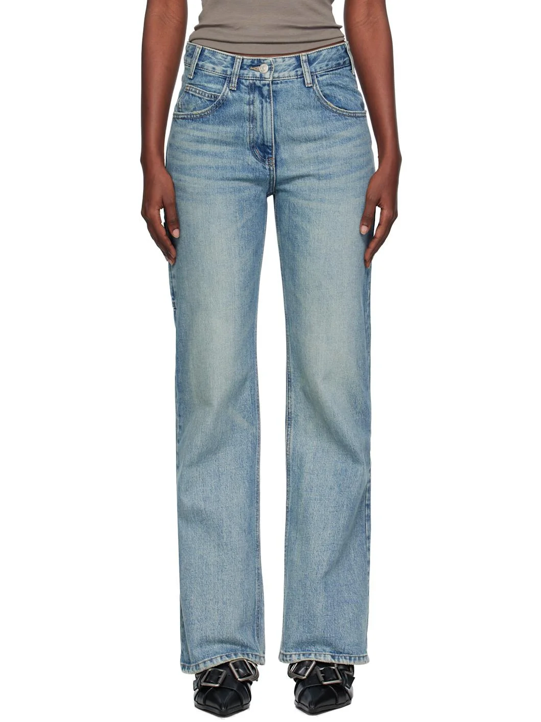 Non-stretch denim jeans. · Fading, whiskering, subtle distressing throughout · Belt loops · Five-pocket styling · Zip fly · Logo patch at back waistband · Patch pockets at back leg · Logo-engraved silver-tone hardware Supplier color: Blue Body: 100% cotton. Pocket lining: 65% polyester, 35% cotton. Made in South Korea 252731F069002