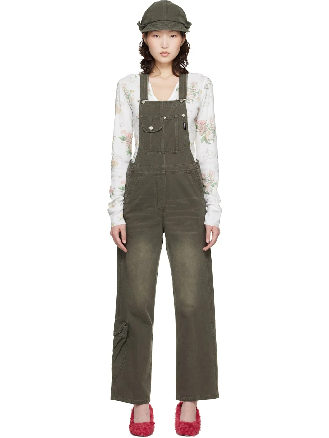 Cotton canvas overalls. · Fading throughout · Square neck · Flap pocket, patch pocket, and logo flag at chest · Four-pocket styling · Mock fly · Adjustable shoulder straps · Cargo pocket at outseams · Cinch strap at back Supplier color: Brown 100% cotton. Made in South Korea 261731F070000