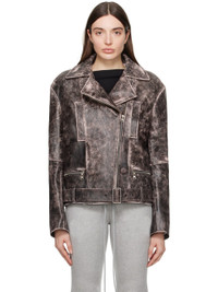 Cracked leather jacket. Distressing throughout. · Paneled construction · Notched lapel · Offset zip closure · Zip pockets and welt pockets · Button hardware at front · Belt loops and detachable pin-buckle belt at hem · Zip expansion panel at cuffs · Perforated logo at back collar · Welt pocket at interior · Polyester satin lining Supplier color: Brown