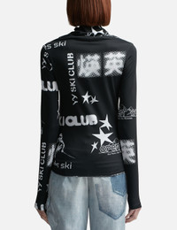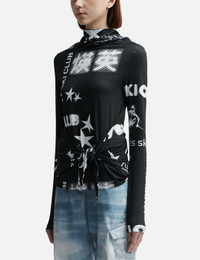 - Open YY - Collage Knot Top - Fitted cut - Stretchy jersey fabric - Long sleeve - High neck - Printed collage graphic at front - Self-tie knot detail - Color: Black - Material: 87% Polyester, 13% Polyurethane - See more Tops and Clothing SIZING - Model wears size 1 - Model measures: Height 177cm, Chest 32”/81cm, Waist 23.5”/59.7cm, Hip 33’’/83.8cm